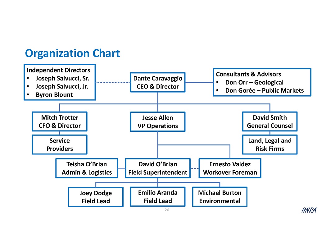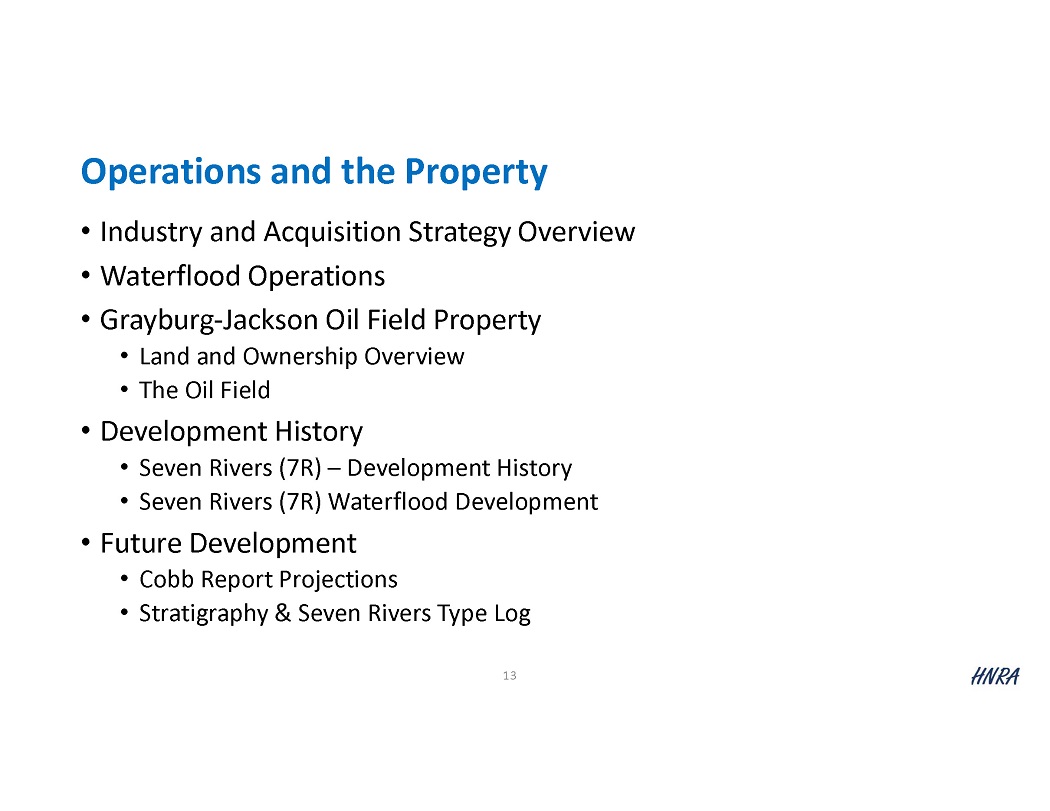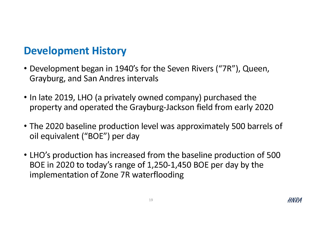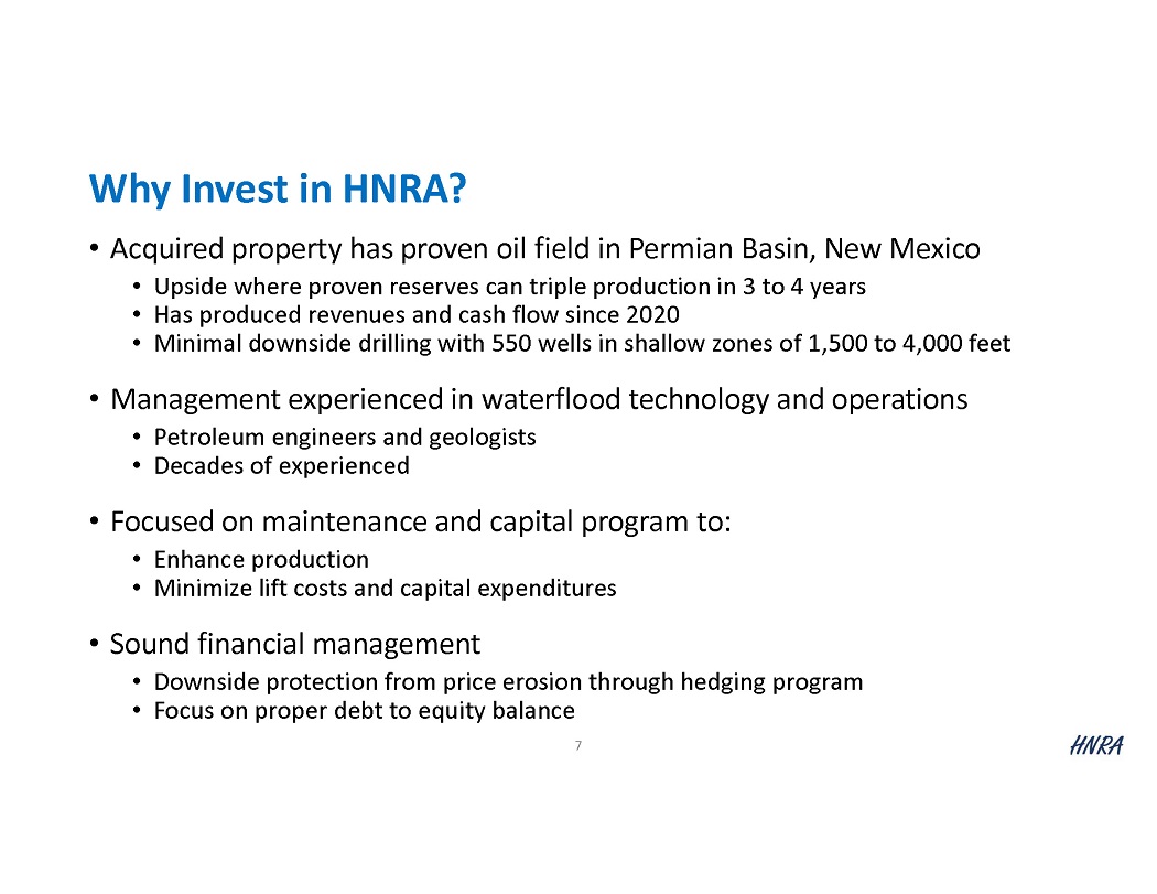 Disclaimer • Forward - Looking Statements • Statements in this presentation which are not statements of historical fact are “forward - looking statements” . Our forward - looking statements include, but are not limited to, statements regarding our or our management team’s expectations, hopes, beliefs, intentions or strategies regarding the future . In addition, any statements that refer to projections, forecasts or other characterizations of future events or circumstances, including any underlying assumptions, are forward - looking statements . The words “anticipate,” “believe,” “continue,” “could,” “estimate,” “expect,” “intends,” “may,” “might,” “plan,” “possible,” “potential,” “predict,” “project,” “should,” “would” and similar expressions may identify forward - looking statements, but the absence of these words does not mean that a statement is not forward - looking . All statements other than statements of historical fact included in this presentation are forward - looking statements and are based on various underlying assumptions and expectations and are subject to known and unknown risks and uncertainties, and may include projections of our future financial performance based on our growth strategies, business plans and anticipated trends in our business . These forward - looking statements, are only predictions based on our current expectations and projections about future events . There are important factors that could cause our actual results, level of activity, performance or achievements to differ materially from the results, level of activity, performance, targets, goals or achievements expressed or implied in the forward - looking statements . These factors include, but are not limited to, those discussed in our Annual Report on Form 10 - K under Item 1 A “Risk Factors,” and also discussed from time to time in our quarterly reports on Form 10 - Q, current reports on Form 8 - K, proxy statements, and other SEC filings including the following : ( 1 ) the financial and business performance of the Company, ( 2 ) the Company’s abilities to execute its business strategies, ( 3 ) the level of production on our properties, ( 4 ) overall and regional supply and demand factors, delays, or interruptions of production, ( 5 ) competition in the oil and natural gas industry, ( 6 ) risks associated with the drilling and operation of crude oil and natural gas wells, including uncertainties with respect to identified drilling locations and estimates of reserves, and ( 7 ) the effect of existing and future laws and regulatory actions, including federal and state legislative and regulatory initiatives relating to hydraulic fracturing and environmental matters, including climate change . These forward - looking statements are based on the information available to, and the expectations and assumptions deemed reasonable by, the Company at the time this presentation was prepared . Although the Company believes that the assumptions underlying such statements are reasonable, it cannot give assurance that they will be attained . We undertake no obligation to update or revise any forward - looking statements, whether as a result of new information, future events or otherwise, except as may be required under applicable securities law . You are cautioned not to place undue reliance upon any forward - looking statements, which speak only as of the date made . HNRA undertakes no commitment to update or revise the forward - looking statements, whether as a result of new information, future events or otherwise, except as may be required by law . • In preparing this presentation, the Company has substantially and materially relied on the Evaluations of Certain Oil and Gas Properties ("reserve reports") rendered by William M . Cobb & Associates, Inc . ("Cobb"), an unrelated third party that had previously been engaged and compensated by HNRA concerning the oil and gas assets owned by HNRA including, without limitation, the proved reserves and future income as of the date of the Cobb reserve reports, the most recent reflecting values as of December 31 , 2022 . 5