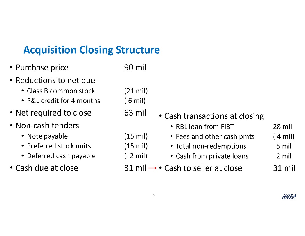 Acquisition Closing Structure • Purchase price • Reductions to net due • Class B common stock • P&L credit for 4 months • Net required to close • Non - cash tenders • Note payable • Preferred stock units • Deferred cash payable • Cash due at close 90 mil (21 mil) ( 6 mil) 63 mil (15 mil) (15 mil) ( 2 mil) 31 mil • Cash transactions at closing • RBL loan from FIBT • Fees and other cash pmts • Total non - redemptions • Cash from private loans • Cash to seller at close 28 mil ( 4 mil) 5 mil 2 mil 31 mil 9