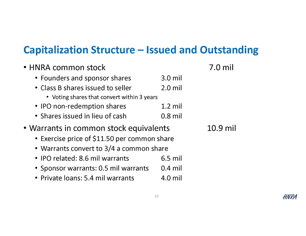 Capitalization Structure – Issued and Outstanding • HNRA common stock • Founders and sponsor shares • Class B shares issued to seller • Voting shares that convert within 3 years • IPO non - redemption shares • Shares issued in lieu of cash 7.0 mil 3.0 mil 2.0 mil 1.2 mil 0.8 mil • Warrants in common stock equivalents • Exercise price of $11.50 per common share • Warrants convert to 3/4 a common share 10.9 mil • IPO related: 8.6 mil warrants • Sponsor warrants: 0.5 mil warrants • Private loans: 5.4 mil warrants 6.5 mil 0.4 mil 4.0 mil 10