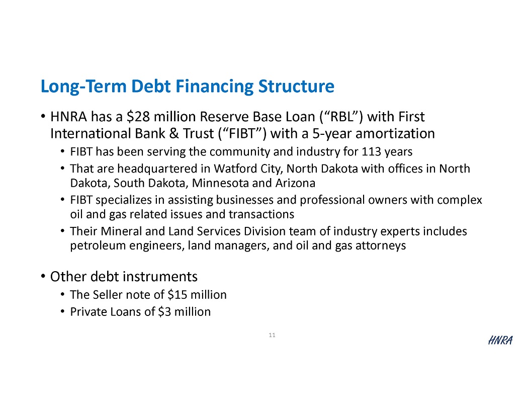 Long - Term Debt Financing Structure • HNRA has a $28 million Reserve Base Loan (“RBL”) with First International Bank & Trust (“FIBT”) with a 5 - year amortization • FIBT has been serving the community and industry for 113 years • That are headquartered in Watford City, North Dakota with offices in North Dakota, South Dakota, Minnesota and Arizona • FIBT specializes in assisting businesses and professional owners with complex oil and gas related issues and transactions • Their Mineral and Land Services Division team of industry experts includes petroleum engineers, land managers, and oil and gas attorneys • Other debt instruments • The Seller note of $15 million • Private Loans of $3 million 11