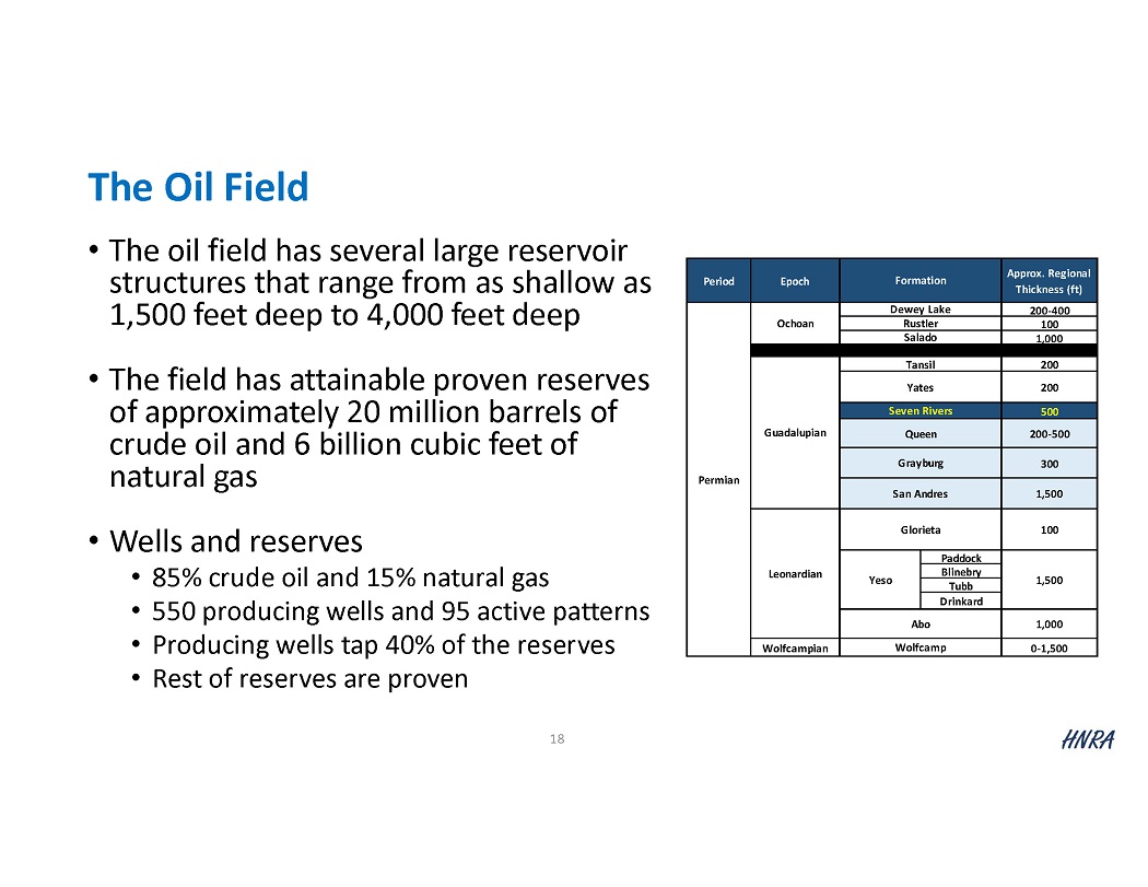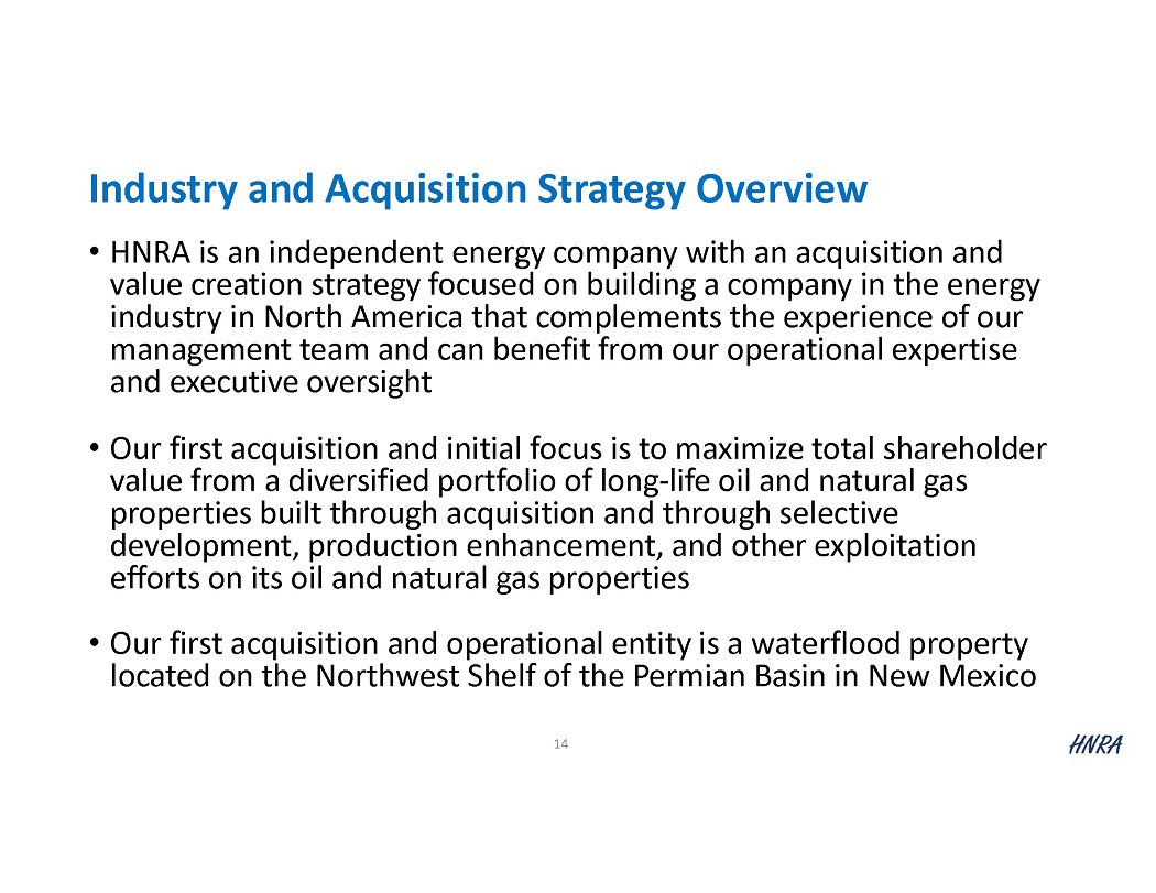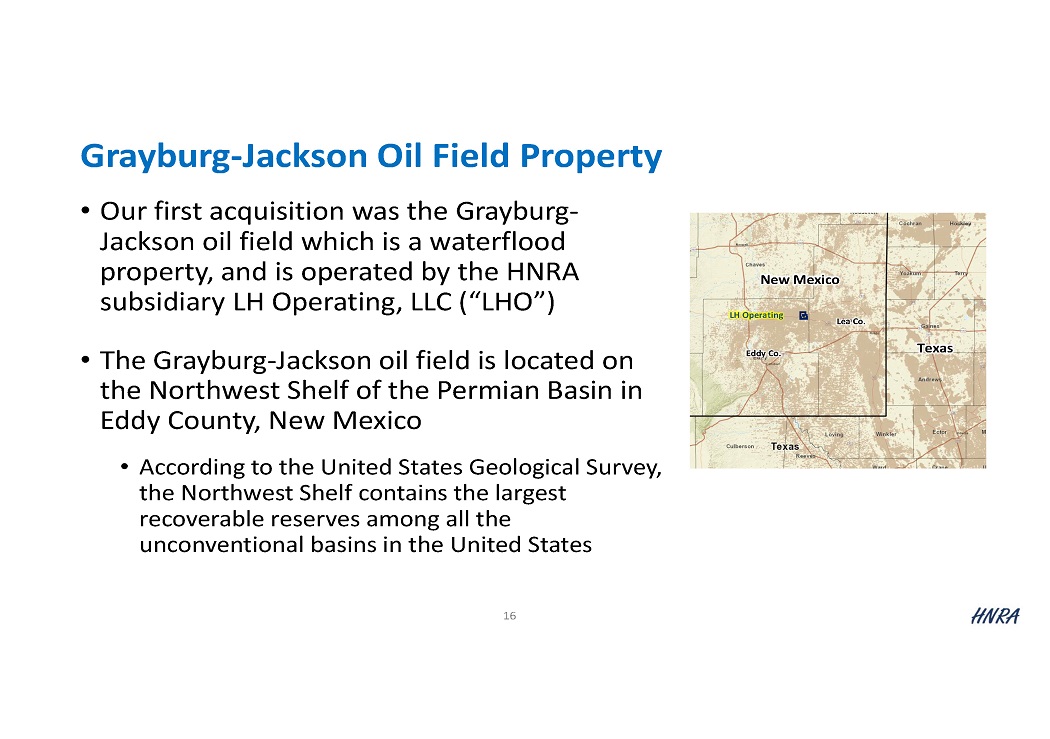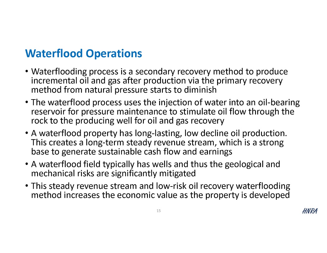 Industry and Acquisition Strategy Overview • HNRA is an independent energy company with an acquisition and value creation strategy focused on building a company in the energy industry in North America that complements the experience of our management team and can benefit from our operational expertise and executive oversight • Our first acquisition and initial focus is to maximize total shareholder value from a diversified portfolio of long - life oil and natural gas properties built through acquisition and through selective development, production enhancement, and other exploitation efforts on its oil and natural gas properties • Our first acquisition and operational entity is a waterflood property located on the Northwest Shelf of the Permian Basin in New Mexico 14