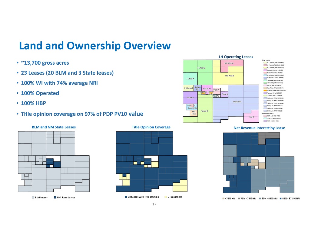 Grayburg - Jackson Oil Field Property • Our first acquisition was the Grayburg - Jackson oil field which is a waterflood property, and is operated by the HNRA subsidiary LH Operating, LLC (“LHO”) • The Grayburg - Jackson oil field is located on the Northwest Shelf of the Permian Basin in Eddy County, New Mexico • According to the United States Geological Survey, the Northwest Shelf contains the largest recoverable reserves among all the unconventional basins in the United States New Mexico Texas Eddy Co. Lea Co. LH Operating 16