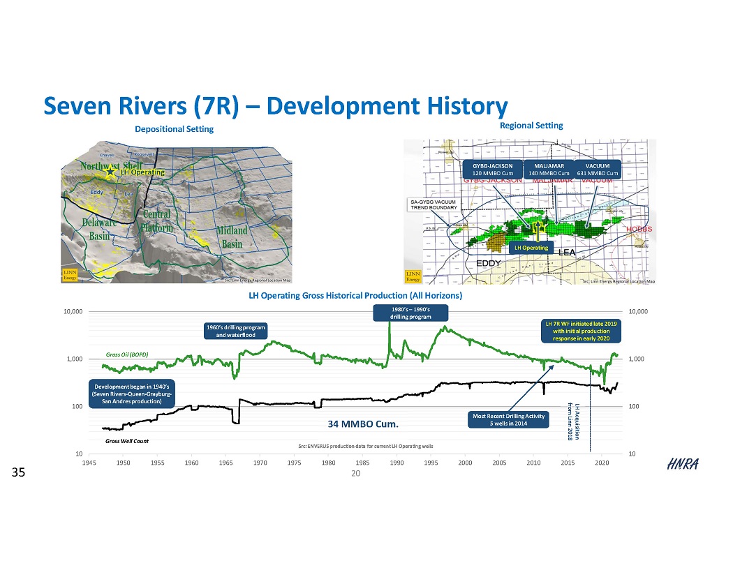 10 100 1,000 10,000 10 100 1,000 10,000 1945 1950 1955 1960 1965 1970 2000 2005 2010 2015 2020 Seven Rivers (7R) – Development History Depositional Setting LH Operating Regional Setting GYBG - JACKSON 120 MMBO Cum MALJAMAR 140 MMBO Cum VACUUM 631 MMBO Cum LH Operating Gross Oil (BOPD) Gross Well Count Development began in 1940’s (Seven Rivers - Queen - Grayburg - San Andres production) 1960’s drilling program and waterflood LH Operating Gross Historical Production (All Horizons) 1980’s – 1990’s drilling program 34 MMBO Cum. Src: ENVERUS production data for current LH Operating wells 1975 1980 1985 1990 1995 Most Recent Drilling Activity 5 wells in 2014 LH 7R WF initiated late 2019 with initial production response in early 2020 LH Acquisition from Linn 2018 35 20