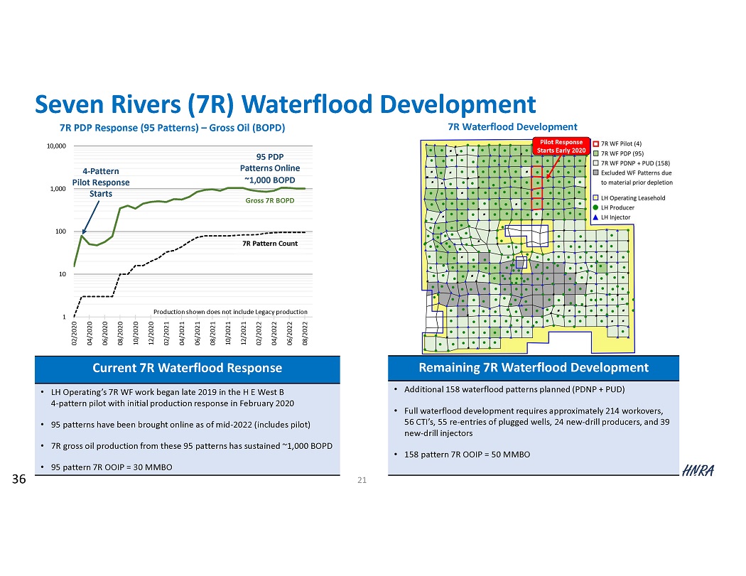 Seven Rivers (7R) Waterflood Development 7R Waterflood Development Pilot Response Starts Early 2020 Current 7R Waterflood Response • LH Operating’s 7R WF work began late 2019 in the H E West B 4 - pattern pilot with initial production response in February 2020 • 95 patterns have been brought online as of mid - 2022 (includes pilot) • 7R gross oil production from these 95 patterns has sustained ~1,000 BOPD • 95 pattern 7R OOIP = 30 MMBO Remaining 7R Waterflood Development • Additional 158 waterflood patterns planned (PDNP + PUD) • Full waterflood development requires approximately 214 workovers, 56 CTI’s, 55 re - entries of plugged wells, 24 new - drill producers, and 39 new - drill injectors • 158 pattern 7R OOIP = 50 MMBO 7R PDP Response (95 Patterns) – Gross Oil (BOPD) 10,000 1 10 100 1,000 02/2020 04/2020 06/2020 08/2020 10/2020 12/2020 02/2021 04/2021 06/2021 08/2021 10/2021 12/2021 02/2022 04/2022 06/2022 08/2022 4 - Pattern Pilot Response Starts 95 PDP Patterns Online ~1,000 BOPD Production shown does not include Legacy production 7R Pattern Count Gross 7R BOPD 36 20