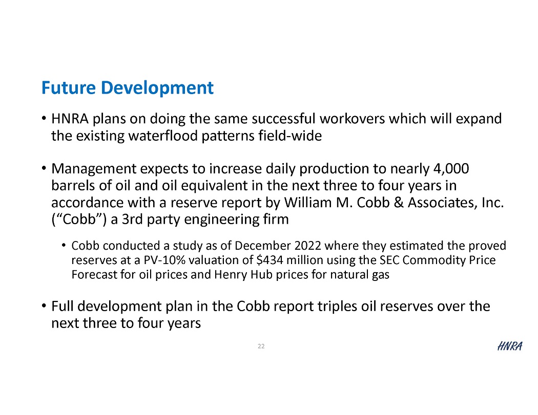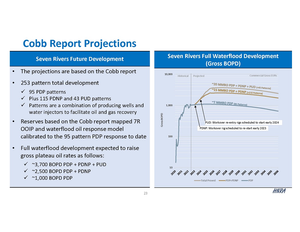 Future Development • HNRA plans on doing the same successful workovers which will expand the existing waterflood patterns field - wide • Management expects to increase daily production to nearly 4,000 barrels of oil and oil equivalent in the next three to four years in accordance with a reserve report by William M. Cobb & Associates, Inc. (“Cobb”) a 3rd party engineering firm • Cobb conducted a study as of December 2022 where they estimated the proved reserves at a PV - 10% valuation of $434 million using the SEC Commodity Price Forecast for oil prices and Henry Hub prices for natural gas • Full development plan in the Cobb report triples oil reserves over the next three to four years 22