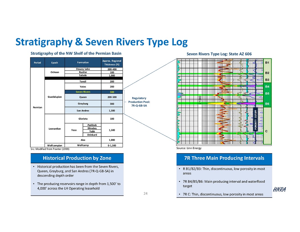 Regulatory Production Pool: 7R - Q - GB - SA Approx. Regional Thickness (ft) Formation Epoch Period 200 - 400 Dewey Lake Ochoan Permian 100 Rustler 1,000 Salado 200 Tansil Guadalupian 200 Yates 500 Seven Rivers 200 - 500 Queen 300 Grayburg 1,500 San Andres 100 Glorieta Leonardian 1,500 Paddock Yeso Blinebry Tubb Drinkard 1,000 Abo 0 - 1,500 Wolfcamp Wolfcampian Historical Production by Zone • Historical production has been from the Seven Rivers, Queen, Grayburg, and San Andres (7R - Q - GB - SA) in descending depth order • The producing reservoirs range in depth from 1,500’ to 4,000’ across the LH Operating leasehold Stratigraphy & Seven Rivers Type Log Source: Linn Energy Src: Modified from Pranter (1999) 7R Three Main Producing Intervals • R B1/B2/B3: Thin, discontinuous, low porosity in most areas • 7R B4/B5/B6: Main producing interval and waterflood target • 7R C: Thin, discontinuous, low porosity in most areas Stratigraphy of the NW Shelf of the Permian Basin Seven Rivers Type Log: State AZ 606 24
