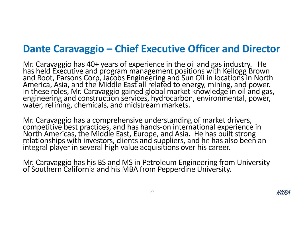 Dante Caravaggio – Chief Executive Officer and Director Mr. Caravaggio has 40+ years of experience in the oil and gas industry. He has held Executive and program management positions with Kellogg Brown and Root, Parsons Corp, Jacobs Engineering and Sun Oil in locations in North America, Asia, and the Middle East all related to energy, mining, and power. In these roles, Mr. Caravaggio gained global market knowledge in oil and gas, engineering and construction services, hydrocarbon, environmental, power, water, refining, chemicals, and midstream markets. Mr. Caravaggio has a comprehensive understanding of market drivers, competitive best practices, and has hands - on international experience in North Americas, the Middle East, Europe, and Asia. He has built strong relationships with investors, clients and suppliers, and he has also been an integral player in several high value acquisitions over his career. Mr. Caravaggio has his BS and MS in Petroleum Engineering from University of Southern California and his MBA from Pepperdine University. 27