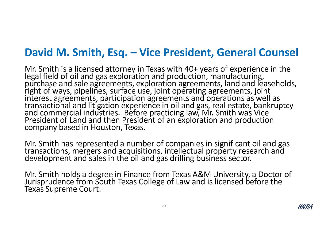 David M. Smith, Esq. – Vice President, General Counsel Mr. Smith is a licensed attorney in Texas with 40+ years of experience in the legal field of oil and gas exploration and production, manufacturing, purchase and sale agreements, exploration agreements, land and leaseholds, right of ways, pipelines, surface use, joint operating agreements, joint interest agreements, participation agreements and operations as well as transactional and litigation experience in oil and gas, real estate, bankruptcy and commercial industries. Before practicing law, Mr. Smith was Vice President of Land and then President of an exploration and production company based in Houston, Texas. Mr. Smith has represented a number of companies in significant oil and gas transactions, mergers and acquisitions, intellectual property research and development and sales in the oil and gas drilling business sector. Mr. Smith holds a degree in Finance from Texas A&M University, a Doctor of Jurisprudence from South Texas College of Law and is licensed before the Texas Supreme Court. 29