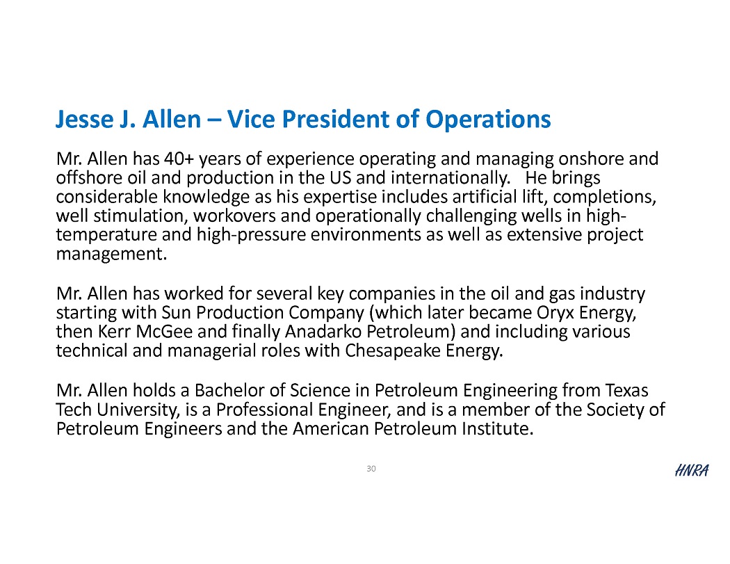 Jesse J. Allen – Vice President of Operations Mr. Allen has 40+ years of experience operating and managing onshore and offshore oil and production in the US and internationally. He brings considerable knowledge as his expertise includes artificial lift, completions, well stimulation, workovers and operationally challenging wells in high - temperature and high - pressure environments as well as extensive project management. Mr. Allen has worked for several key companies in the oil and gas industry starting with Sun Production Company (which later became Oryx Energy, then Kerr McGee and finally Anadarko Petroleum) and including various technical and managerial roles with Chesapeake Energy. Mr. Allen holds a Bachelor of Science in Petroleum Engineering from Texas Tech University, is a Professional Engineer, and is a member of the Society of Petroleum Engineers and the American Petroleum Institute. 30