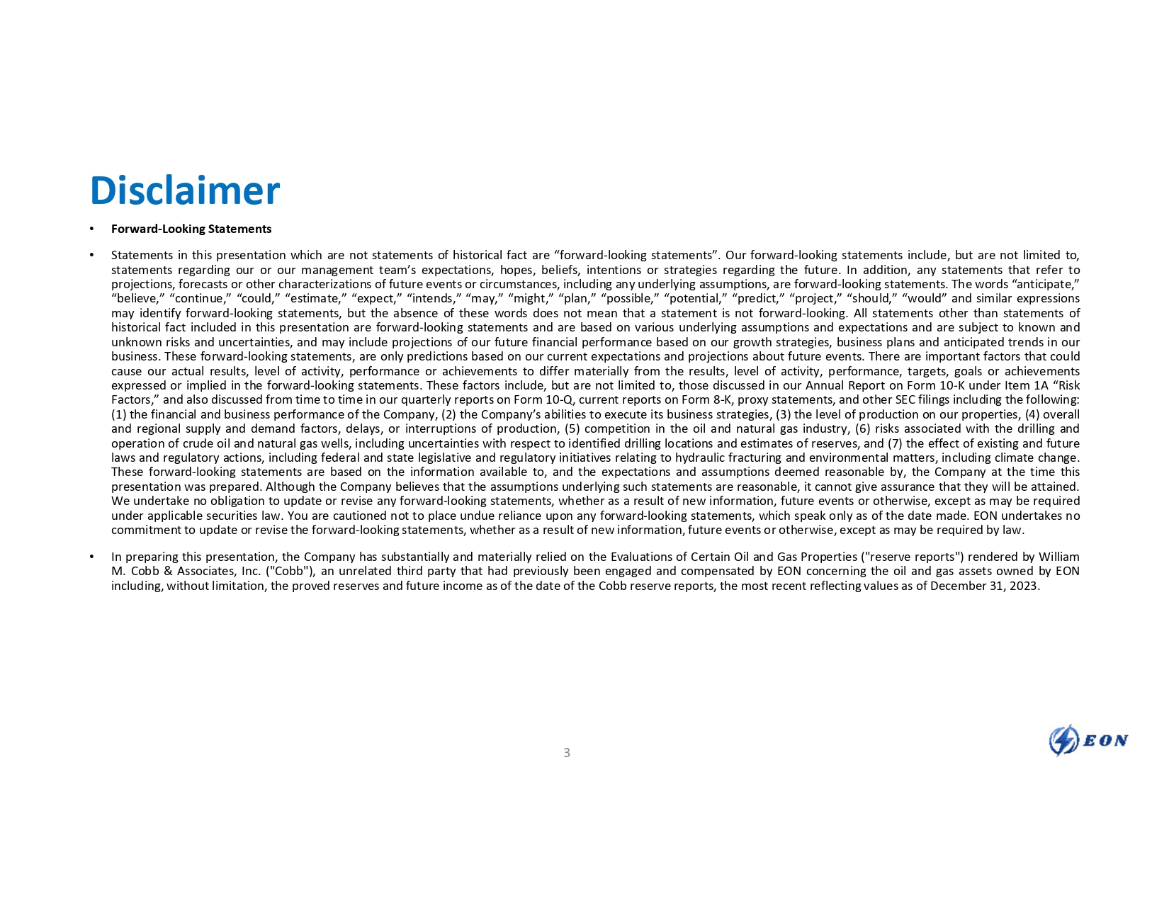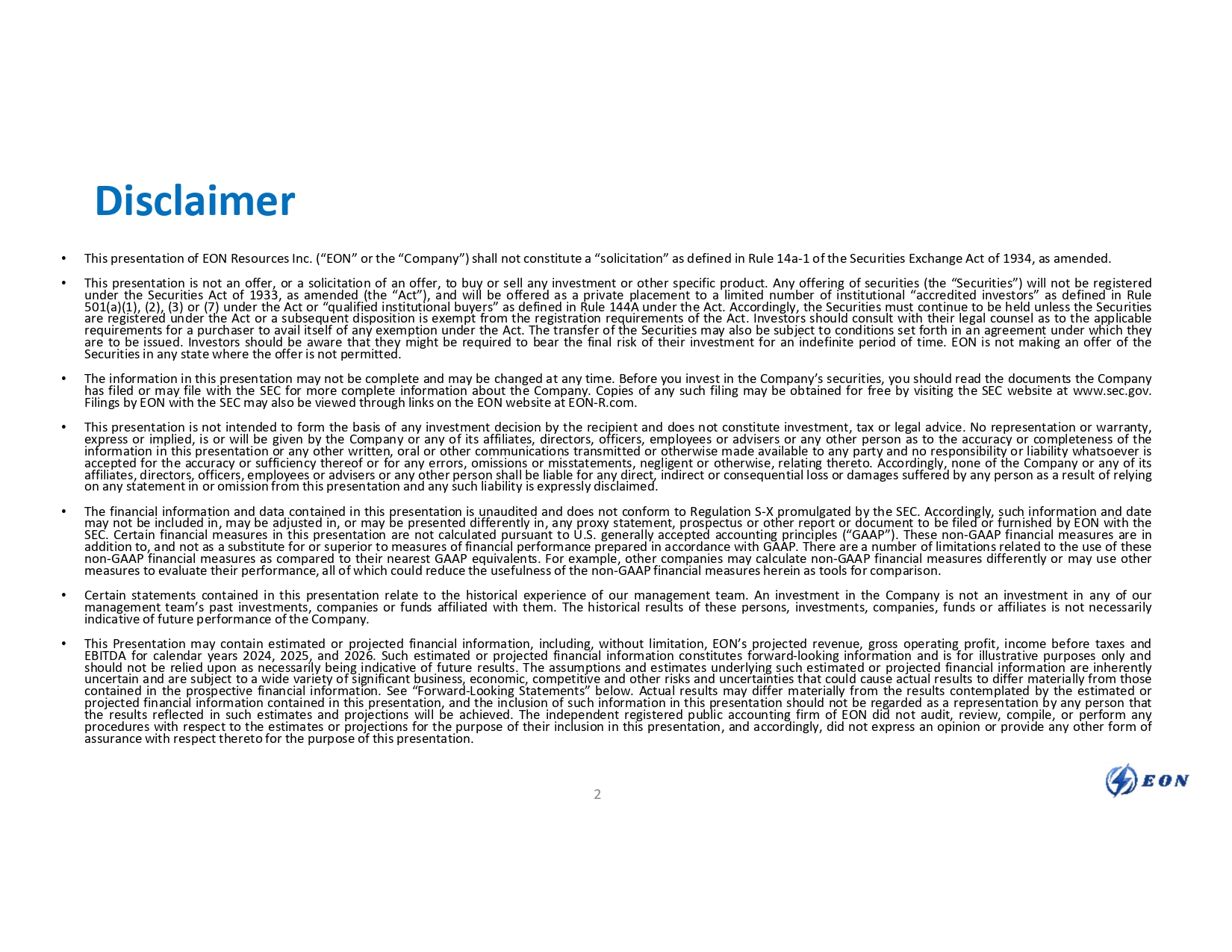 Disclaimer • This presentation of EON Resources Inc . (“EON” or the “Company”) shall not constitute a “solicitation” as defined in Rule 14 a - 1 of the Securities Exchange Act of 1934 , as amended . • This presentation is not an offer, or a solicitation of an offer, to buy or sell any investment or other specific product . Any offering of securities (the “Securities”) will not be registered under the Securities Act of 1933 , as amended (the “Act”), and will be offered as a private placement to a limited number of institutional “accredited investors” as defined in Rule 501 (a)( 1 ), ( 2 ), ( 3 ) or ( 7 ) under the Act or “qualified institutional buyers” as defined in Rule 144 A under the Act . Accordingly, the Securities must continue to be held unless the Securities are registered under the Act or a subsequent disposition is exempt from the registration requirements of the Act . Investors should consult with their legal counsel as to the applicable requirements for a purchaser to avail itself of any exemption under the Act . The transfer of the Securities may also be subject to conditions set forth in an agreement under which they are to be issued . Investors should be aware that they might be required to bear the final risk of their investment for an indefinite period of time . EON is not making an offer of the Securities in any state where the offer is not permitted . • The information in this presentation may not be complete and may be changed at any time . Before you invest in the Company’s securities, you should read the documents the Company has filed or may file with the SEC for more complete information about the Company . Copies of any such filing may be obtained for free by visiting the SEC website at www . sec . gov . Filings by EON with the SEC may also be viewed through links on the EON website at EON - R . com . • This presentation is not intended to form the basis of any investment decision by the recipient and does not constitute investment, tax or legal advice . No representation or warranty, express or implied, is or will be given by the Company or any of its affiliates, directors, officers, employees or advisers or any other person as to the accuracy or completeness of the information in this presentation or any other written, oral or other communications transmitted or otherwise made available to any party and no responsibility or liability whatsoever is accepted for the accuracy or sufficiency thereof or for any errors, omissions or misstatements, negligent or otherwise, relating thereto . Accordingly, none of the Company or any of its affiliates, directors, officers, employees or advisers or any other person shall be liable for any direct, indirect or consequential loss or damages suffered by any person as a result of relying on any statement in or omission from this presentation and any such liability is expressly disclaimed . • The financial information and data contained in this presentation is unaudited and does not conform to Regulation S - X promulgated by the SEC . Accordingly, such information and date may not be included in, may be adjusted in, or may be presented differently in, any proxy statement, prospectus or other report or document to be filed or furnished by EON with the SEC . Certain financial measures in this presentation are not calculated pursuant to U . S . generally accepted accounting principles (“GAAP”) . These non - GAAP financial measures are in addition to, and not as a substitute for or superior to measures of financial performance prepared in accordance with GAAP . There are a number of limitations related to the use of these non - GAAP financial measures as compared to their nearest GAAP equivalents . For example, other companies may calculate non - GAAP financial measures differently or may use other measures to evaluate their performance, all of which could reduce the usefulness of the non - GAAP financial measures herein as tools for comparison . • Certain statements contained in this presentation relate to the historical experience of our management team . An investment in the Company is not an investment in any of our management team’s past investments, companies or funds affiliated with them . The historical results of these persons, investments, companies, funds or affiliates is not necessarily indicative of future performance of the Company . • This Presentation may contain estimated or projected financial information, including, without limitation, EON ’s projected revenue, gross operating profit, income before taxes and EBITDA for calendar years 2024 , 2025 , and 2026 . Such estimated or projected financial information constitutes forward - looking information and is for illustrative purposes only and should not be relied upon as necessarily being indicative of future results . The assumptions and estimates underlying such estimated or projected financial information are inherently uncertain and are subject to a wide variety of significant business, economic, competitive and other risks and uncertainties that could cause actual results to differ materially from those contained in the prospective financial information . See “Forward - Looking Statements” below . Actual results may differ materially from the results contemplated by the estimated or projected financial information contained in this presentation, and the inclusion of such information in this presentation should not be regarded as a representation by any person that the results reflected in such estimates and projections will be achieved . T he independent registered public accounting firm of EON did not audit, review, compile, or perform any procedures with respect to the estimates or projections for the purpose of their inclusion in this presentation, and accordingly , did not express an opinion or provide any other form of assurance with respect thereto for the purpose of this presentation . 2