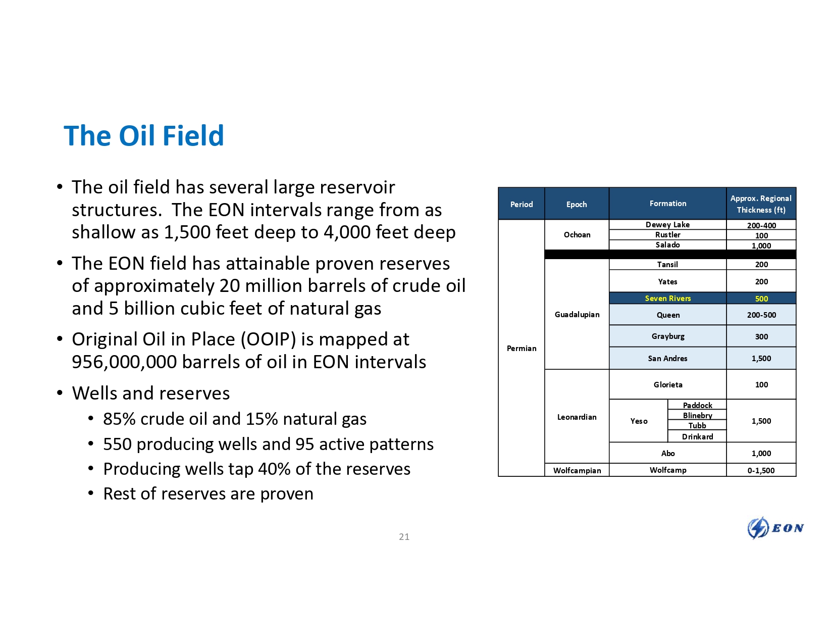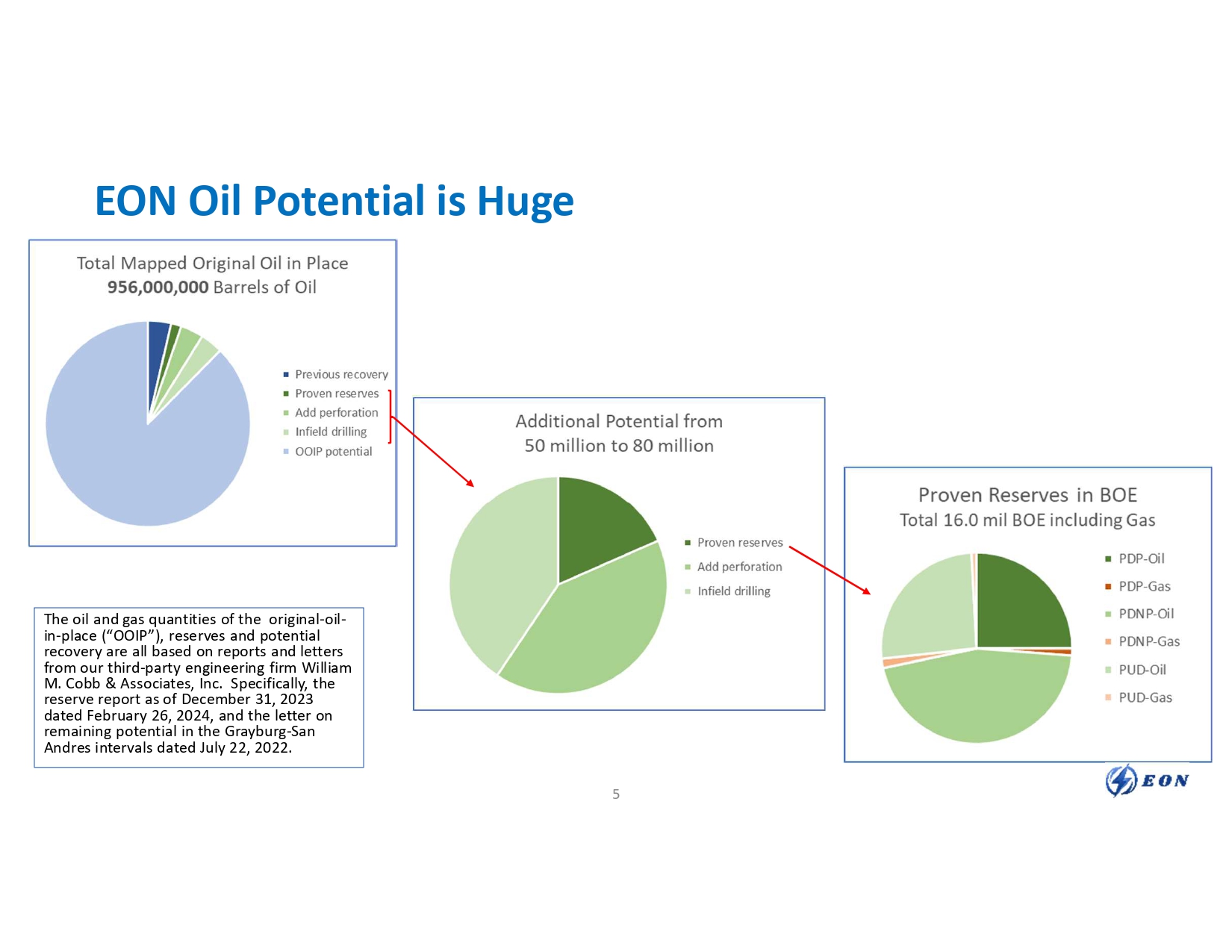 EON Oil Potential is Huge 5 The oil and gas quantities of the original - oil - in - place (“OOIP”), reserves and potential recovery are all based on reports and letters from our third - party engineering firm William M. Cobb & Associates, Inc. Specifically, the reserve report as of December 31, 2023 dated February 26, 2024, and the letter on remaining potential in the Grayburg - San Andres intervals dated July 22, 2022.