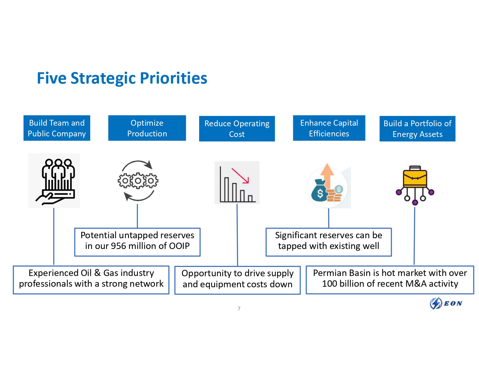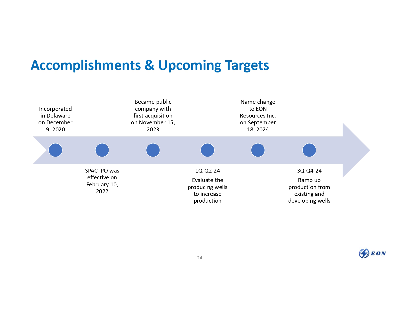 Accomplishments & Upcoming Targets 24 Incorporated in Delaware on December 9, 2020 SPAC IPO was effective on February 10, 2022 Became public company with first acquisition on November 15, 2023 1Q - Q2 - 24 Evaluate the producing wells to increase production Name change to EON Resources Inc. on September 18, 2024 3Q - Q4 - 24 Ramp up production from existing and developing wells