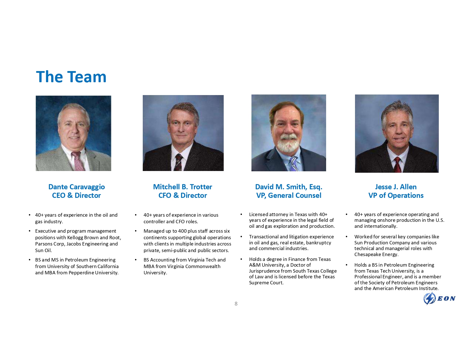 Five Strategic Priorities 7 Build Team and Public Company Optimize Production Reduce Operating Cost Enhance Capital Efficiencies Build a Portfolio of Energy Assets Experienced Oil & Gas industry professionals with a strong network Potential untapped reserves in our 956 million of OOIP Opportunity to drive supply and equipment costs down Significant reserves can be tapped with existing well Permian Basin is hot market with over 100 billion of recent M&A activity