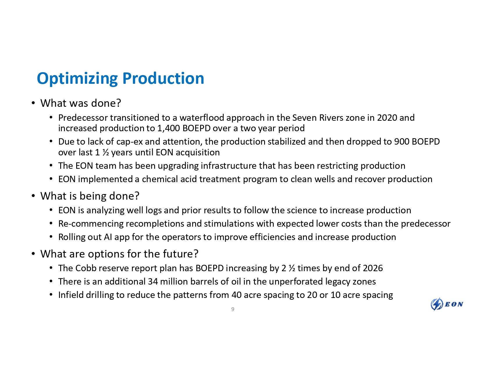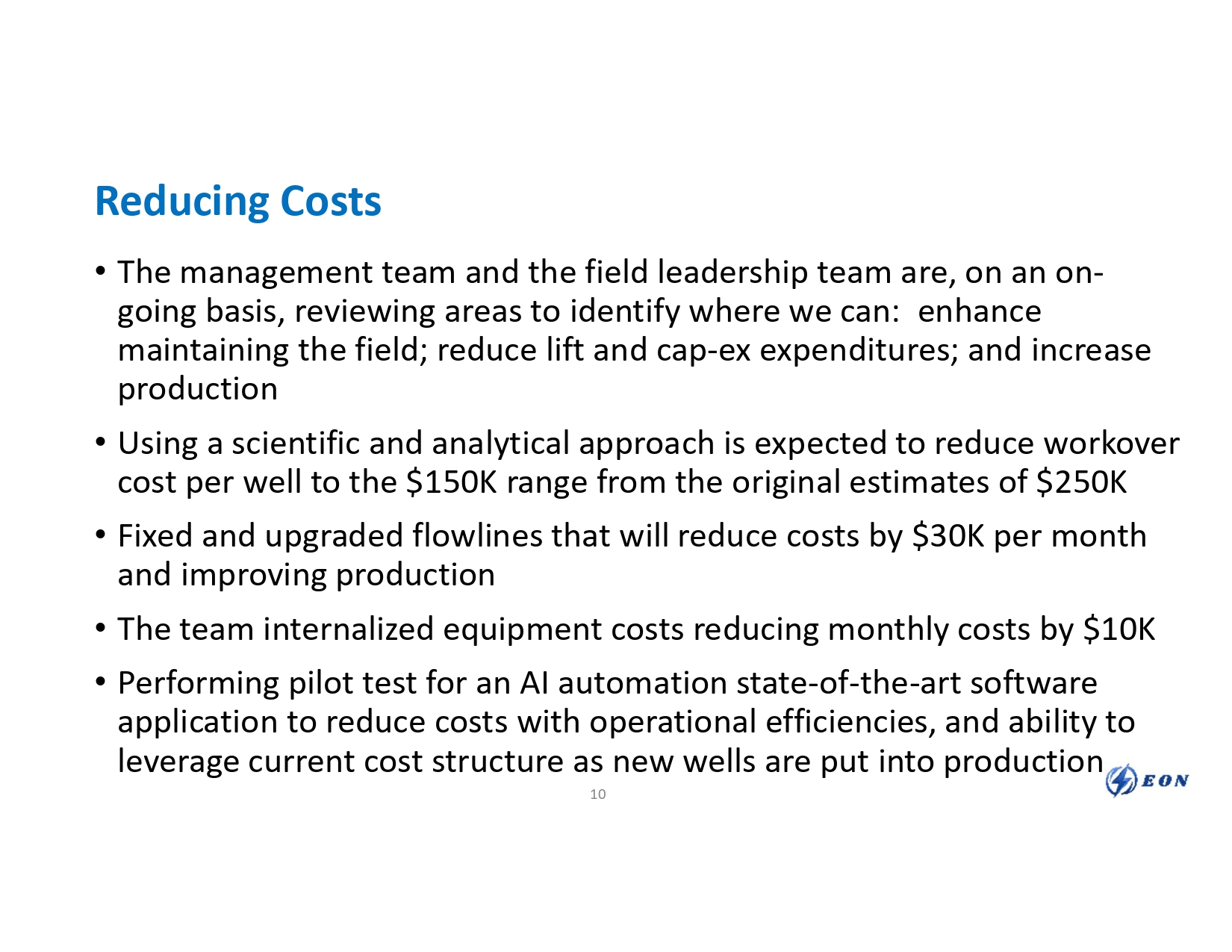 Optimizing Production • What was done? • Predecessor transitioned to a waterflood approach in the Seven Rivers zone in 2020 and increased production to 1,400 BOEPD over a two year period • Due to lack of cap - ex and attention, the production stabilized and then dropped to 900 BOEPD over last 1 ½ years until EON acquisition • The EON team has been upgrading infrastructure that has been restricting production • EON implemented a chemical acid treatment program to clean wells and recover production • What is being done? • EON is analyzing well logs and prior results to follow the science to increase production • Re - commencing recompletions and stimulations with expected lower costs than the predecessor • Rolling out AI app for the operators to improve efficiencies and increase production • What are options for the future? • The Cobb reserve report plan has BOEPD increasing by 2 ½ times by end of 2026 • There is an additional 34 million barrels of oil in the unperforated legacy zones • Infield drilling to reduce the patterns from 40 acre spacing to 20 or 10 acre spacing 9