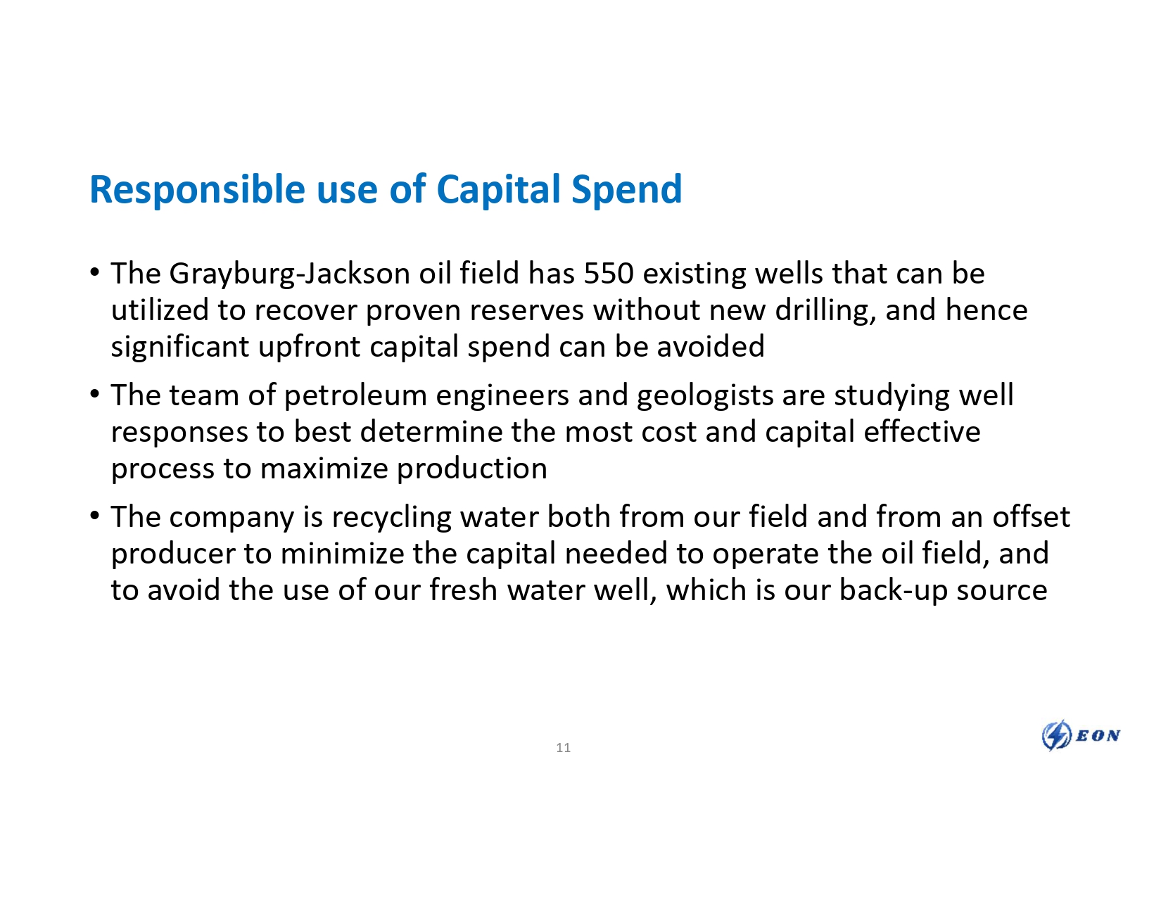 Reducing Costs • The management team and the field leadership team are, on an on - going basis, reviewing areas to identify where we can: enhance maintaining the field; reduce lift and cap - ex expenditures; and increase production • Using a scientific and analytical approach is expected to reduce workover cost per well to the $150K range from the original estimates of $250K • Fixed and upgraded flowlines that will reduce costs by $30K per month and improving production • The team internalized equipment costs reducing monthly costs by $10K • Performing pilot test for an AI automation state - of - the - art software application to reduce costs with operational efficiencies, and ability to leverage current cost structure as new wells are put into production 10
