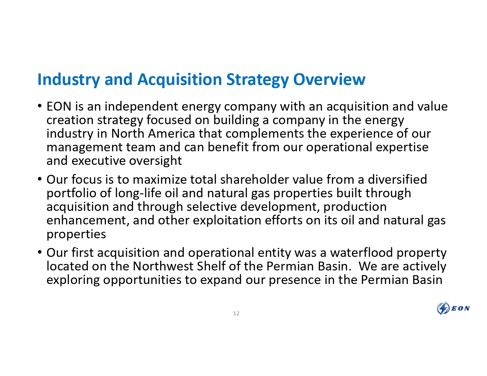 Industry and Acquisition Strategy Overview • EON is an independent energy company with an acquisition and value creation strategy focused on building a company in the energy industry in North America that complements the experience of our management team and can benefit from our operational expertise and executive oversight • Our focus is to maximize total shareholder value from a diversified portfolio of long - life oil and natural gas properties built through acquisition and through selective development, production enhancement, and other exploitation efforts on its oil and natural gas properties • Our first acquisition and operational entity was a waterflood property located on the Northwest Shelf of the Permian Basin. We are actively exploring opportunities to expand our presence in the Permian Basin 12