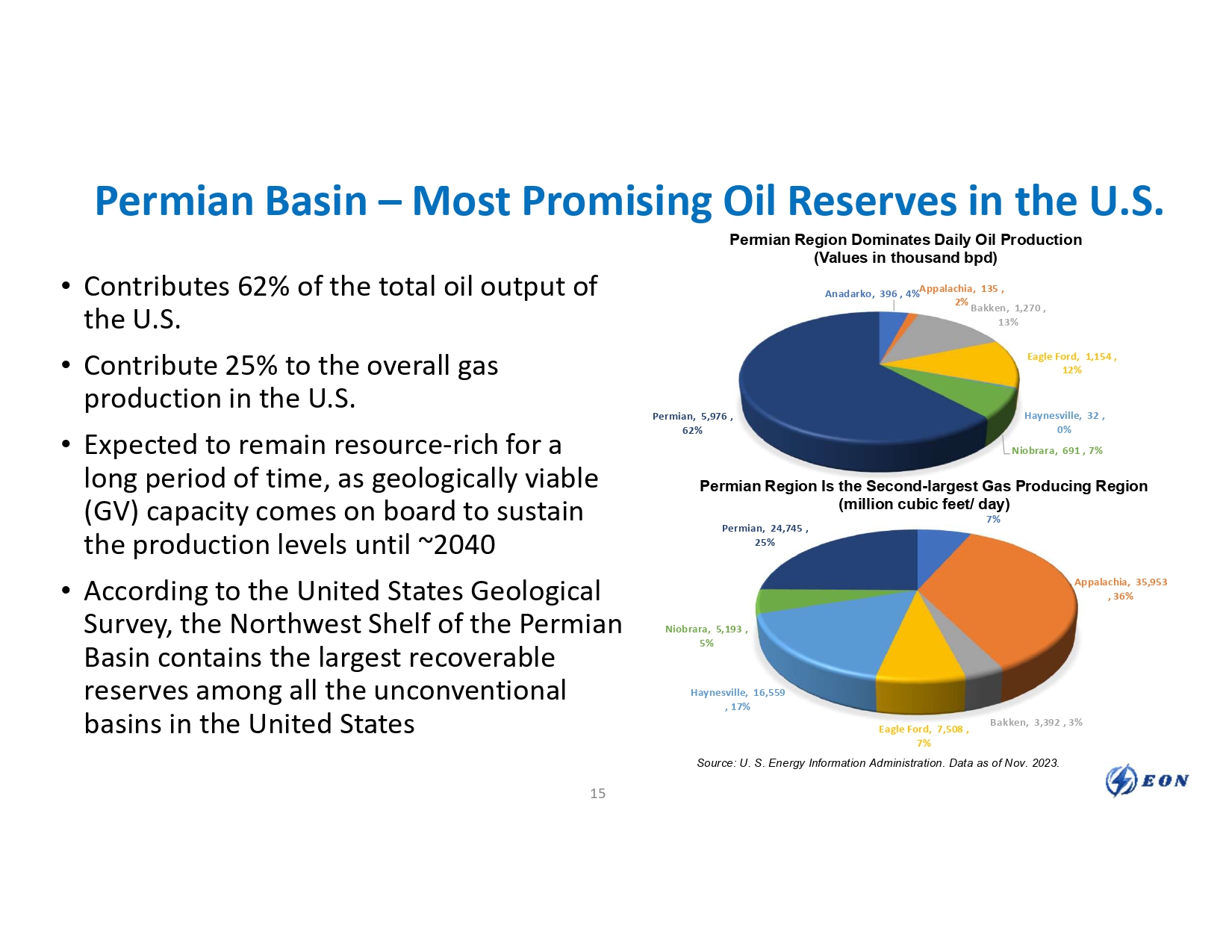 • The first acquisition was the Grayburg - Jackson oil field which is a waterflood property operated by the EON subsidiary LH Operating, LLC (“LHO”) • The property is located on the Northwest Shelf of the Permian Basin which according to the U.S. Geological Survey contains the largest recoverable reserves among all the unconventional basins in the United States 14 14 Grayburg - Jackson Oil Field Overview New Mexico Texas Eddy Co. Lea Co. LH Operating