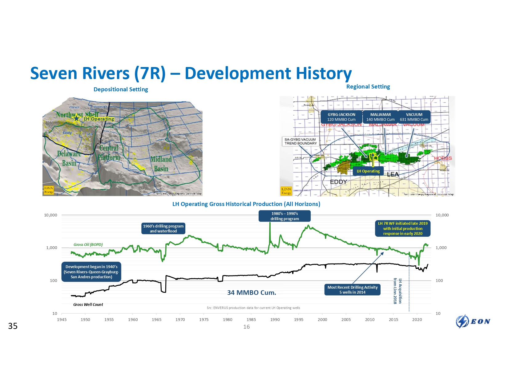 Seven Rivers (7R) Waterflood Development 7R PDP Response (95 Patterns) – Gross Oil (BOPD) 7R Waterflood Development Pilot Response Starts Early 2020 Current 7R Waterflood Response • LH Operating’s 7R WF work began late 2019 in the H E West B 4 - pattern pilot with initial production response in February 2020 • 95 patterns have been brought online as of mid - 2022 (includes pilot) • 7R gross oil production from these 95 patterns has sustained ~1,000 BOPD • 95 pattern 7R OOIP = 30 MMBO Remaining 7R Waterflood Development • Additional 158 waterflood patterns planned (PDNP + PUD) • Full waterflood development requires approximately 214 workovers, 56 CTI’s, 55 re - entries of plugged wells, 24 new - drill producers, and 39 new - drill injectors • 158 pattern 7R OOIP = 50 MMBO 1 10 100 1,000 10,000 02/2020 04/2020 06/2020 08/2020 10/2020 12/2020 02/2021 04/2021 06/2021 08/2021 10/2021 12/2021 02/2022 04/2022 06/2022 08/2022 4 - Pattern Pilot Response Starts 95 PDP Patterns Online ~1,000 BOPD Production shown does not include Legacy production 7R Pattern Count Gross 7R BOPD 36 17