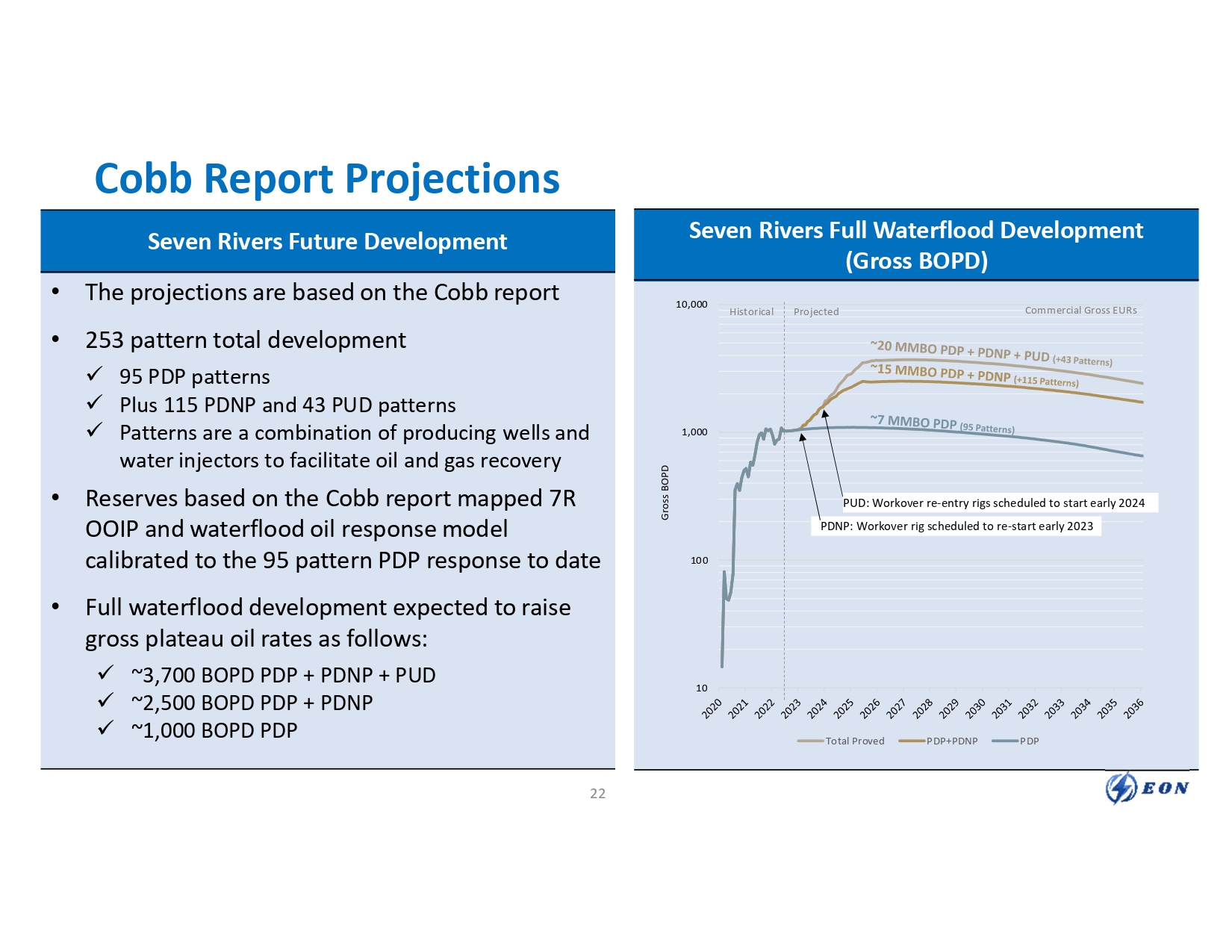 Seven Rivers Full Waterflood Development (Gross BOPD) Cobb Report Projections Seven Rivers Future Development • The projections are based on the Cobb report • 253 pattern total development x 95 PDP patterns x Plus 115 PDNP and 43 PUD patterns x Patterns are a combination of producing wells and water injectors to facilitate oil and gas recovery • Reserves based on the Cobb report mapped 7R OOIP and waterflood oil response model calibrated to the 95 pattern PDP response to date • Full waterflood development expected to raise gross plateau oil rates as follows: x ~3,700 BOPD PDP + PDNP + PUD x ~2,500 BOPD PDP + PDNP x ~1,000 BOPD PDP 10 100 1,000 10,000 Total Proved PDP+PDNP PDP Gross BOPD Commercial Gross EURs PUD: Workover re - entry rigs scheduled to start early 2024 PDNP: Workover rig scheduled to re - start early 2023 Historical Projected 22