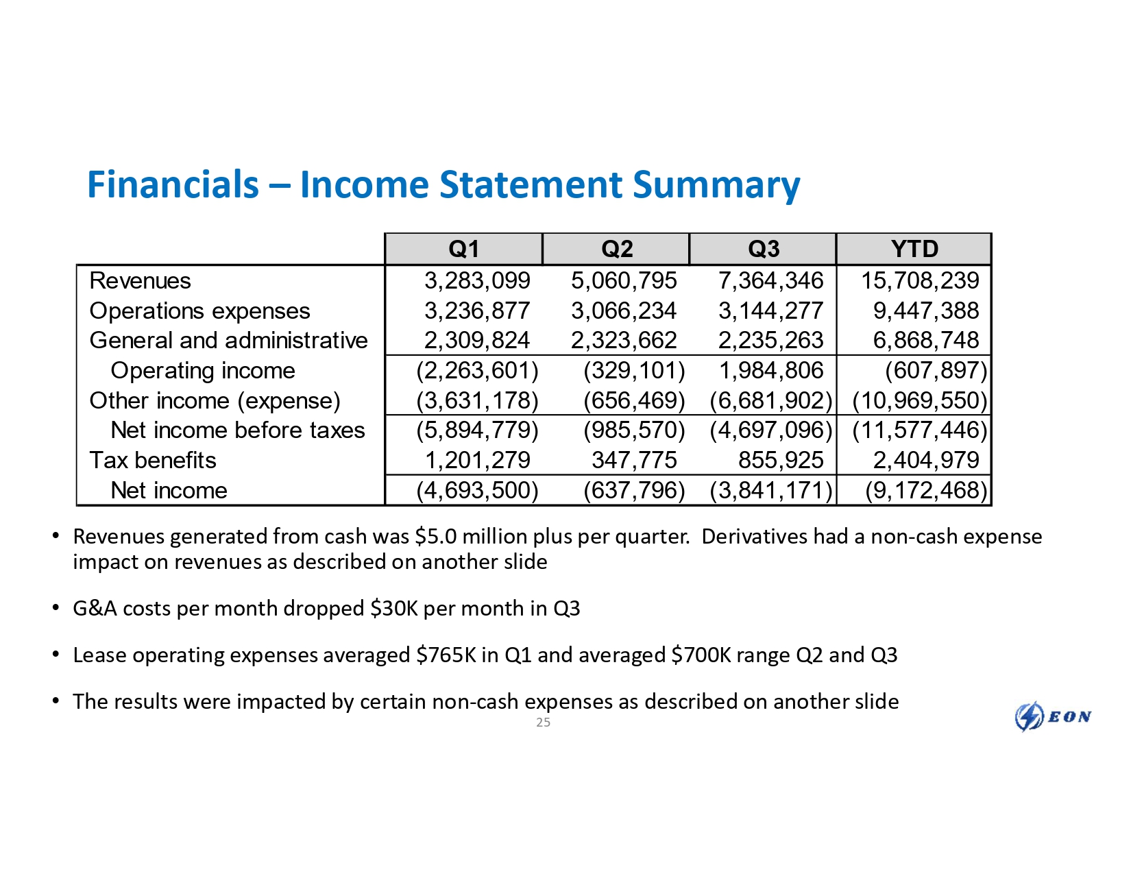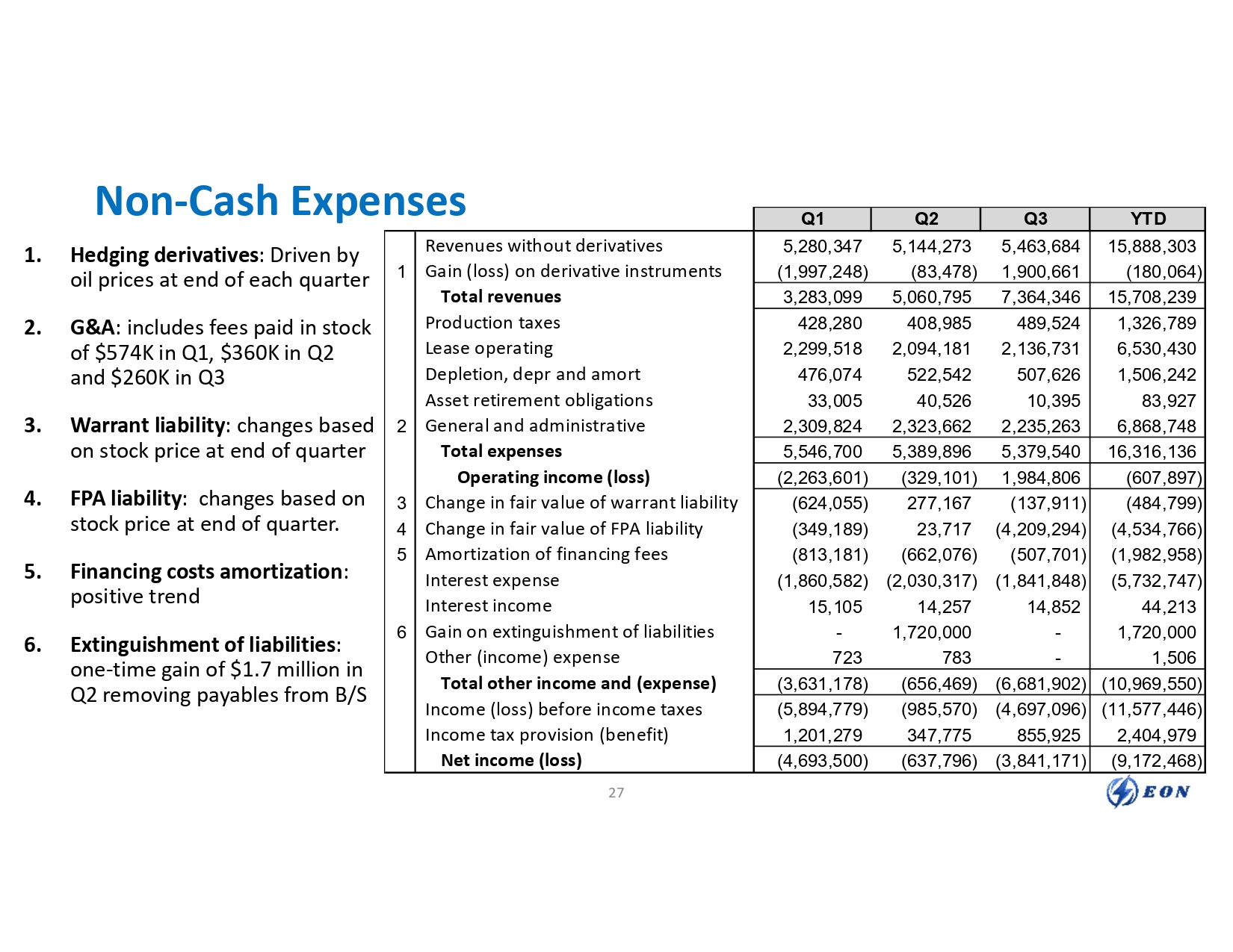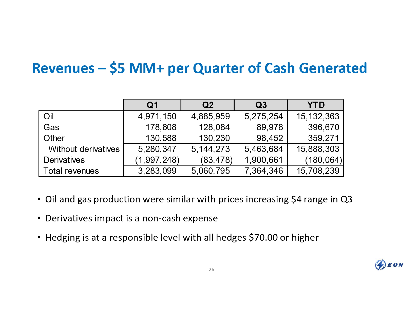 Financials – Income Statement Summary 25 • Revenues generated from cash was $5.0 million plus per quarter. Derivatives had a non - cash expense impact on revenues as described on another slide • G&A costs per month dropped $30K per month in Q3 • Lease operating expenses averaged $765K in Q1 and averaged $700K range Q2 and Q3 • The results were impacted by certain non - cash expenses as described on another slide Q1 Q2 Q3 YTD Revenues 3,283,099 5,060,795 7,364,346 15,708,239 Operations expenses 3,236,877 3,066,234 3,144,277 9,447,388 General and administrative 2,309,824 2,323,662 2,235,263 6,868,748 Operating income (2,263,601) (329,101) 1,984,806 (607,897) Other income (expense) (3,631,178) (656,469) (6,681,902) (10,969,550) Net income before taxes (5,894,779) (985,570) (4,697,096) (11,577,446) Tax benefits 1,201,279 347,775 855,925 2,404,979 Net income (4,693,500) (637,796) (3,841,171) (9,172,468)