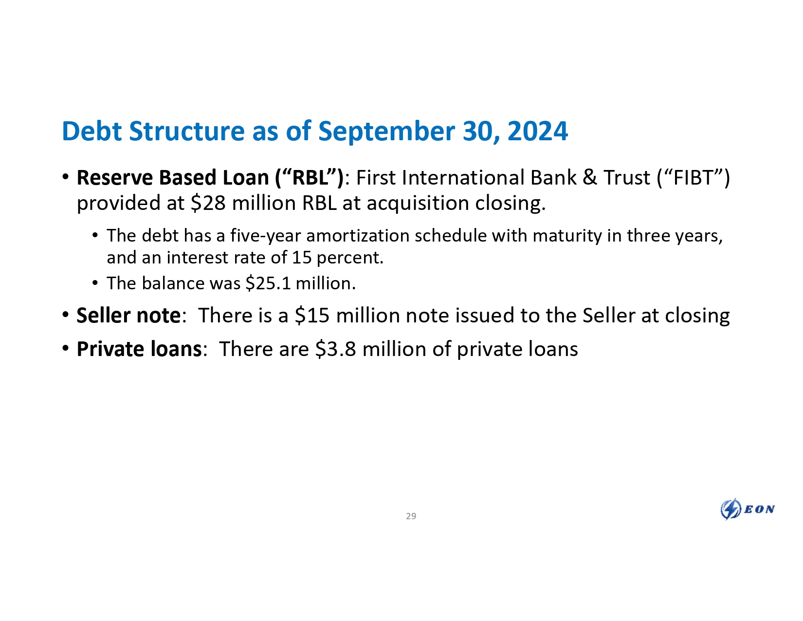 Debt Structure as of September 30, 2024 • Reserve Based Loan (“RBL”) : First International Bank & Trust (“FIBT”) provided at $28 million RBL at acquisition closing. • The debt has a five - year amortization schedule with maturity in three years, and an interest rate of 15 percent. • The balance was $25.1 million. • Seller note : There is a $15 million note issued to the Seller at closing • Private loans : There are $3.8 million of private loans 29