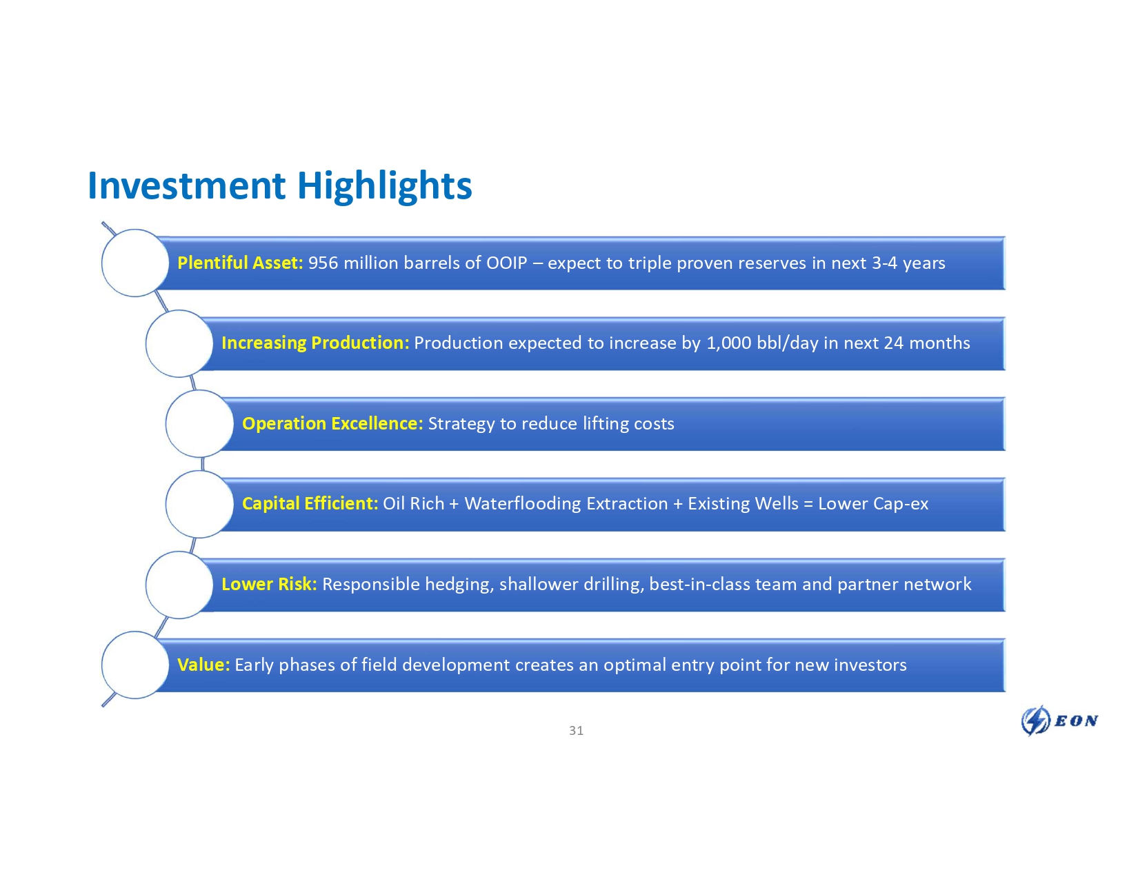 Investment Highlights 4 Plentiful Asset: 956 million barrels of OOIP – expect to triple proven reserves in next 3 - 4 years Increasing Production: Production expected to increase by 1,000 bbl/day in next 24 months Operation Excellence: Strategy to reduce lifting costs Capital Efficient: Oil Rich + Waterflooding Extraction + Existing Wells = Lower Cap - ex Lower Risk: Responsible hedging, shallower drilling, best - in - class team and partner network Value: Early phases of field development creates an optimal entry point for new investors