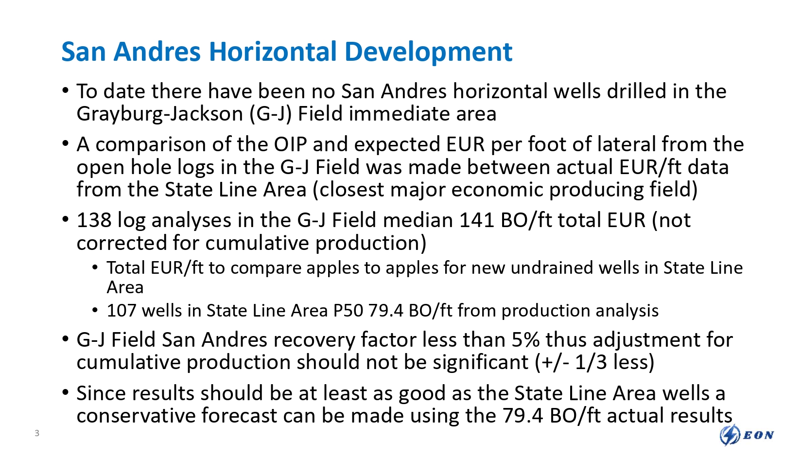 • To date there have been no San Andres horizontal wells drilled in the Grayburg - Jackson (G - J) Field immediate area • A comparison of the OIP and expected EUR per foot of lateral from the open hole logs in the G - J Field was made between actual EUR/ft data from the State Line Area (closest major economic producing field) • 138 log analyses in the G - J Field median 141 BO/ft total EUR (not corrected for cumulative production) • Total EUR/ft to compare apples to apples for new undrained wells in State Line Area • 107 wells in State Line Area P50 79.4 BO/ft from production analysis • G - J Field San Andres recovery factor less than 5% thus adjustment for cumulative production should not be significant (+/ - 1/3 less) • Since results should be at least as good as the State Line Area wells a conservative forecast can be made using the 79.4 BO/ft actual results San Andres Horizontal Development 3