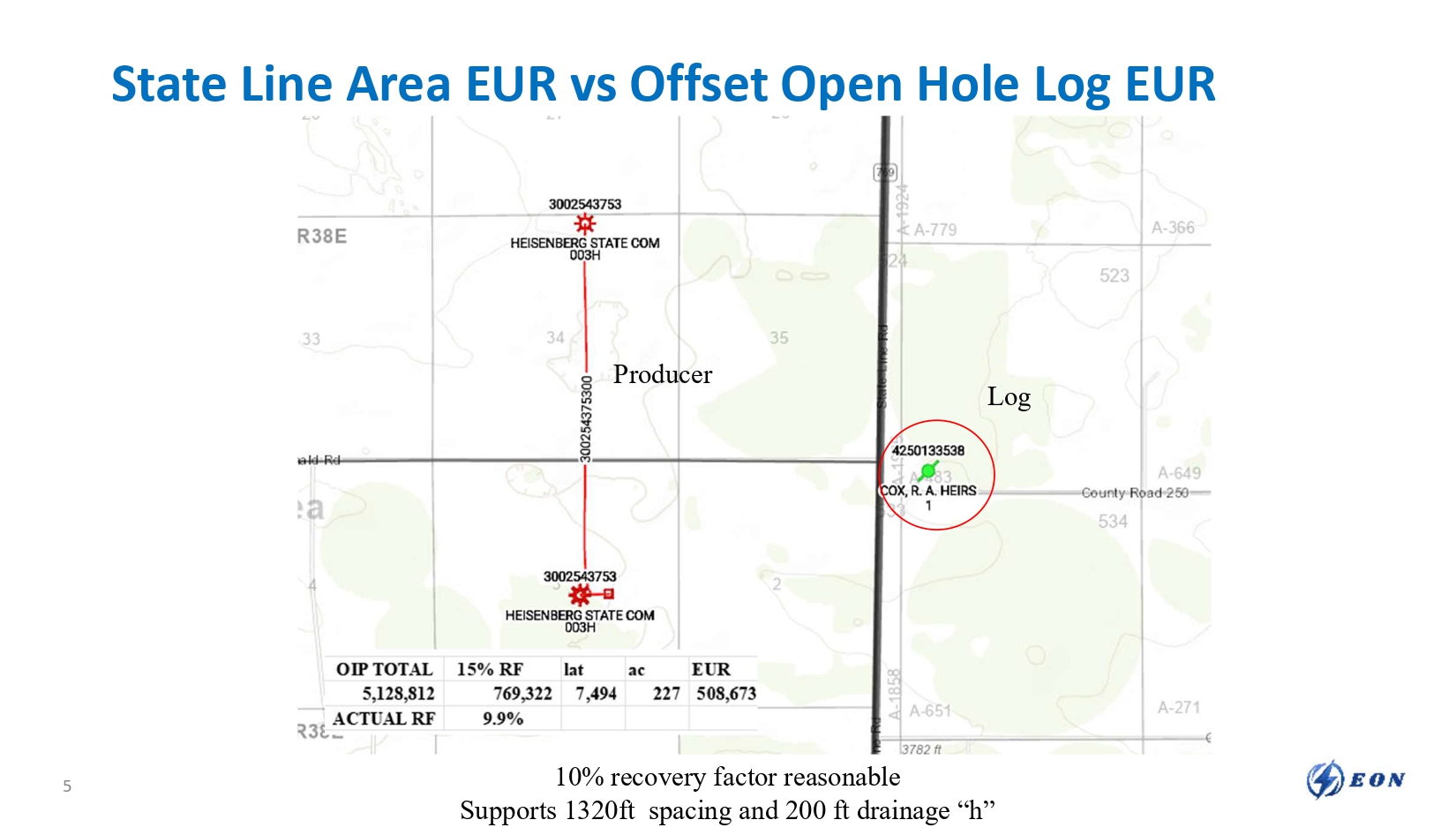Log Producer 10% recovery factor reasonable Supports 1320ft spacing and 200 ft drainage “h” State Line Area EUR vs Offset Open Hole Log EUR 5