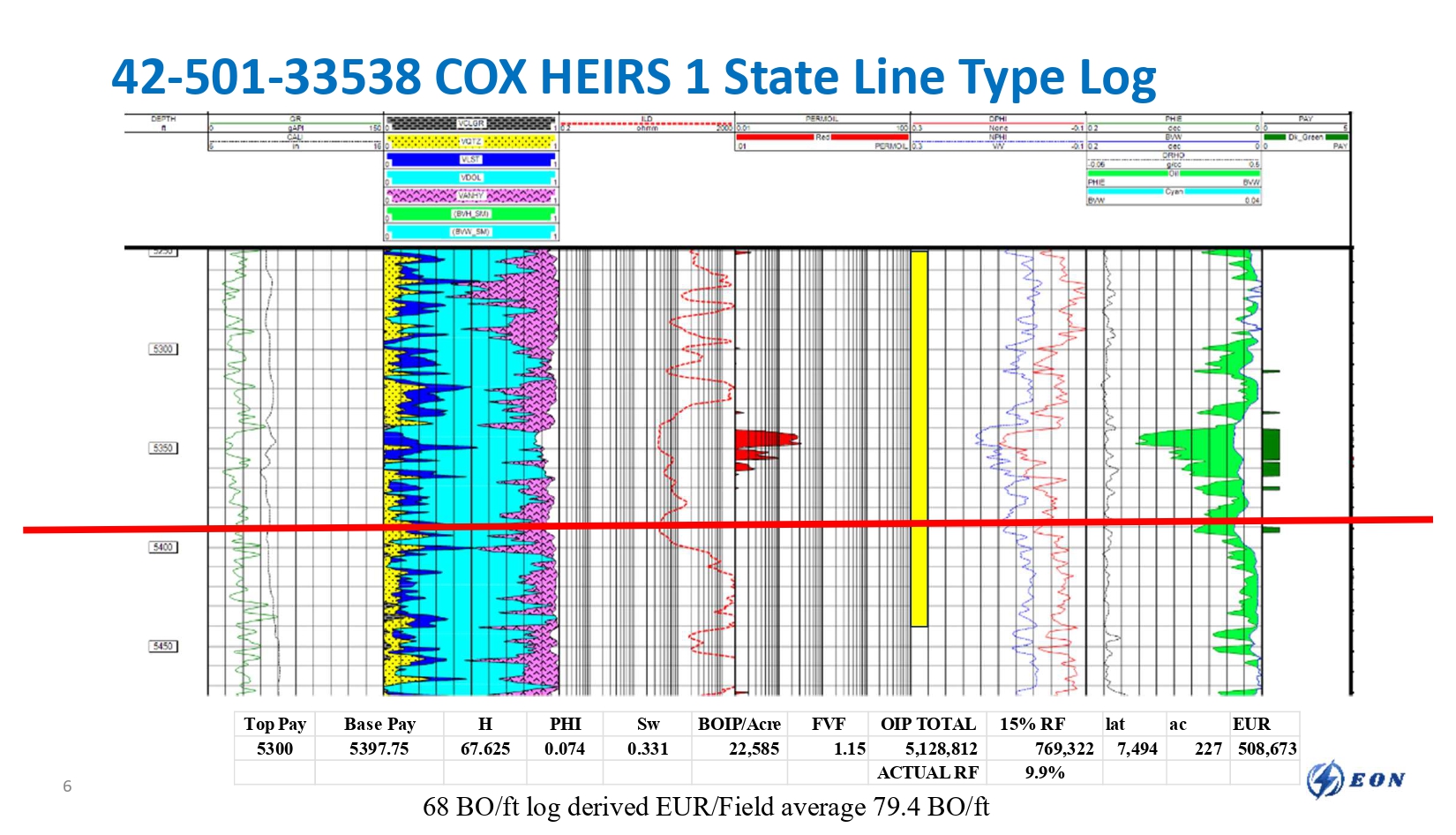 EUR ac lat 15% RF OIP TOTAL FVF BOIP/Acre Sw PHI H Base Pay Top Pay 508,673 227 7,494 769,322 5,128,812 1.15 22,585 0.331 0.074 67.625 5397.75 5300 9.9% ACTUAL RF 68 BO/ft log derived EUR/Field average 79.4 BO/ft 42 - 501 - 33538 COX HEIRS 1 State Line Type Log 6