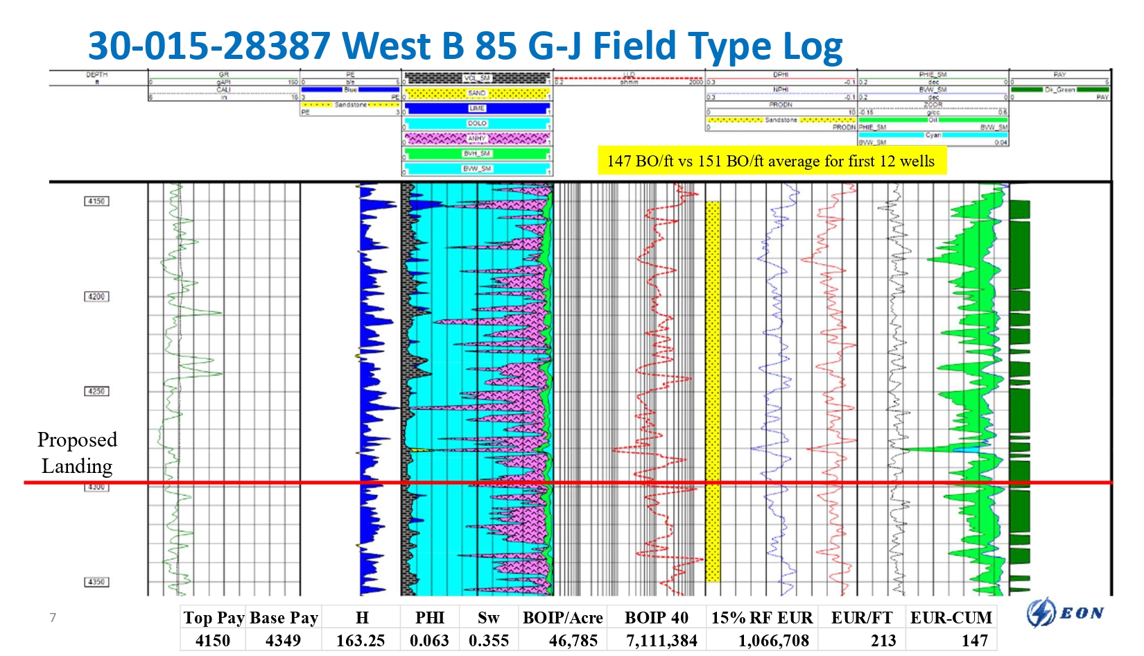 EUR - CUM EUR/FT 15% RF EUR BOIP 40 BOIP/Acre Sw PHI H Base Pay Top Pay 147 213 1,066,708 7,111,384 46,785 0.355 0.063 163.25 4349 4150 147 BO/ft vs 151 BO/ft average for first 12 wells Proposed Landing 30 - 015 - 28387 West B 85 G - J Field Type Log 7