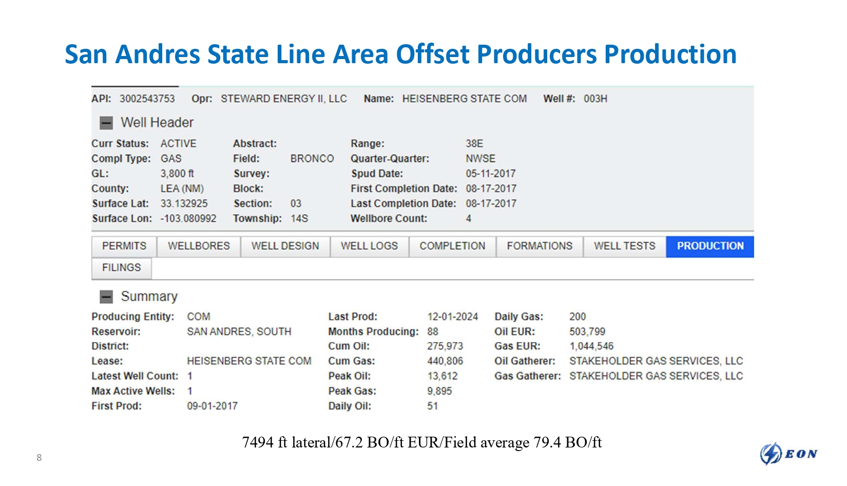7494 ft lateral/67.2 BO/ft EUR/Field average 79.4 BO/ft San Andres State Line Area Offset Producers Production 8