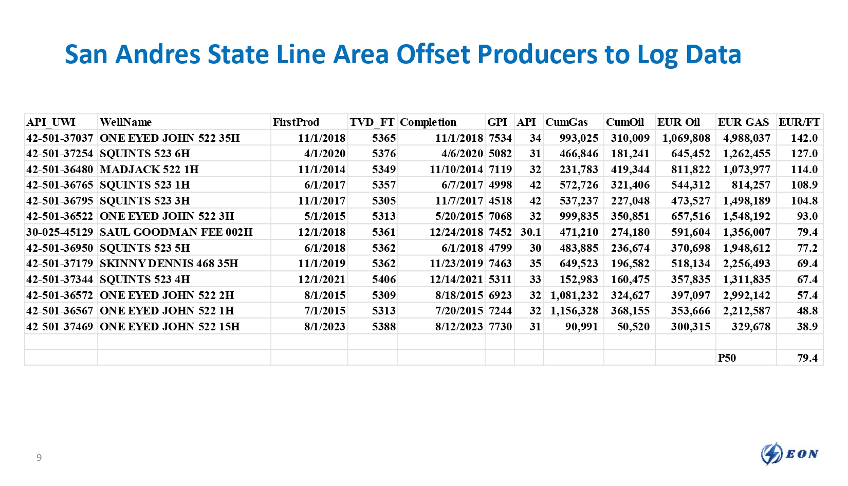 EUR/FT EUR GAS EUR Oil CumOil CumGas API GPI Completion TVD_FT FirstProd WellName API_UWI 142.0 4,988,037 1,069,808 310,009 993,025 34 7534 11/1/2018 5365 11/1/2018 ONE EYED JOHN 522 35H 42 - 501 - 37037 127.0 1,262,455 645,452 181,241 466,846 31 5082 4/6/2020 5376 4/1/2020 SQUINTS 523 6H 42 - 501 - 37254 114.0 1,073,977 811,822 419,344 231,783 32 7119 11/10/2014 5349 11/1/2014 MADJACK 522 1H 42 - 501 - 36480 108.9 814,257 544,312 321,406 572,726 42 4998 6/7/2017 5357 6/1/2017 SQUINTS 523 1H 42 - 501 - 36765 104.8 1,498,189 473,527 227,048 537,237 42 4518 11/7/2017 5305 11/1/2017 SQUINTS 523 3H 42 - 501 - 36795 93.0 1,548,192 657,516 350,851 999,835 32 7068 5/20/2015 5313 5/1/2015 ONE EYED JOHN 522 3H 42 - 501 - 36522 79.4 1,356,007 591,604 274,180 471,210 30.1 7452 12/24/2018 5361 12/1/2018 SAUL GOODMAN FEE 002H 30 - 025 - 45129 77.2 1,948,612 370,698 236,674 483,885 30 4799 6/1/2018 5362 6/1/2018 SQUINTS 523 5H 42 - 501 - 36950 69.4 2,256,493 518,134 196,582 649,523 35 7463 11/23/2019 5362 11/1/2019 SKINNY DENNIS 468 35H 42 - 501 - 37179 67.4 1,311,835 357,835 160,475 152,983 33 5311 12/14/2021 5406 12/1/2021 SQUINTS 523 4H 42 - 501 - 37344 57.4 2,992,142 397,097 324,627 1,081,232 32 6923 8/18/2015 5309 8/1/2015 ONE EYED JOHN 522 2H 42 - 501 - 36572 48.8 2,212,587 353,666 368,155 1,156,328 32 7244 7/20/2015 5313 7/1/2015 ONE EYED JOHN 522 1H 42 - 501 - 36567 38.9 329,678 300,315 50,520 90,991 31 7730 8/12/2023 5388 8/1/2023 ONE EYED JOHN 522 15H 42 - 501 - 37469 79.4 P50 San Andres State Line Area Offset Producers to Log Data 9