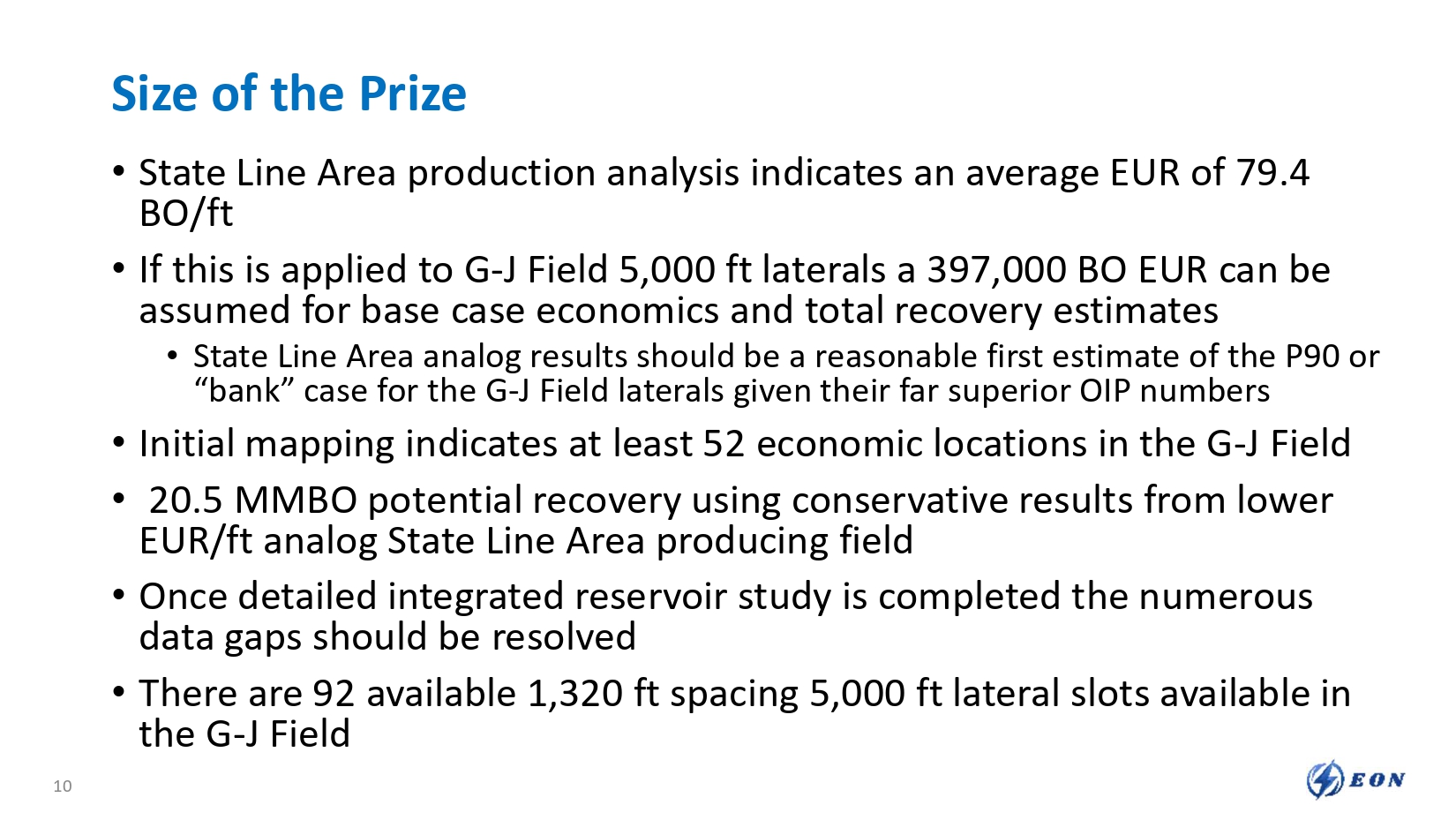 • State Line Area production analysis indicates an average EUR of 79.4 BO/ft • If this is applied to G - J Field 5,000 ft laterals a 397,000 BO EUR can be assumed for base case economics and total recovery estimates • State Line Area analog results should be a reasonable first estimate of the P90 or “bank” case for the G - J Field laterals given their far superior OIP numbers • Initial mapping indicates at least 52 economic locations in the G - J Field • 20.5 MMBO potential recovery using conservative results from lower EUR/ft analog State Line Area producing field • Once detailed integrated reservoir study is completed the numerous data gaps should be resolved • There are 92 available 1,320 ft spacing 5,000 ft lateral slots available in the G - J Field Size of the Prize 10