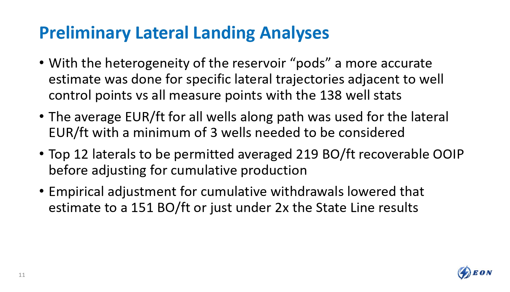• With the heterogeneity of the reservoir “pods” a more accurate estimate was done for specific lateral trajectories adjacent to well control points vs all measure points with the 138 well stats • The average EUR/ft for all wells along path was used for the lateral EUR/ft with a minimum of 3 wells needed to be considered • Top 12 laterals to be permitted averaged 219 BO/ft recoverable OOIP before adjusting for cumulative production • Empirical adjustment for cumulative withdrawals lowered that estimate to a 151 BO/ft or just under 2x the State Line results Preliminary Lateral Landing Analyses 11