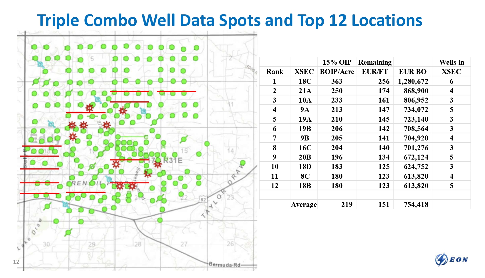 Wells in Remaining 15% OIP XSEC EUR BO EUR/FT BOIP/Acre XSEC Rank 6 1,280,672 256 363 18C 1 4 868,900 174 250 21A 2 3 806,952 161 233 10A 3 5 734,072 147 213 9A 4 3 723,140 145 210 19A 5 3 708,564 142 206 19B 6 4 704,920 141 205 9B 7 3 701,276 140 204 16C 8 5 672,124 134 196 20B 9 3 624,752 125 183 18D 10 4 613,820 123 180 8C 11 5 613,820 123 180 18B 12 754,418 151 219 Average Triple Combo Well Data Spots and Top 12 Locations 12