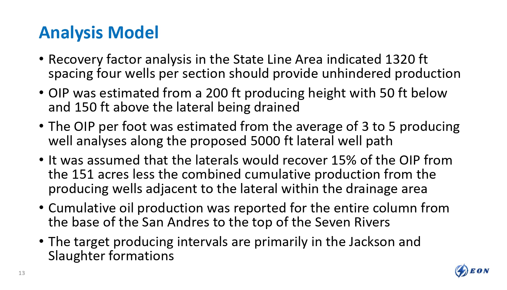 • Recovery factor analysis in the State Line Area indicated 1320 ft spacing four wells per section should provide unhindered production • OIP was estimated from a 200 ft producing height with 50 ft below and 150 ft above the lateral being drained • The OIP per foot was estimated from the average of 3 to 5 producing well analyses along the proposed 5000 ft lateral well path • It was assumed that the laterals would recover 15% of the OIP from the 151 acres less the combined cumulative production from the producing wells adjacent to the lateral within the drainage area • Cumulative oil production was reported for the entire column from the base of the San Andres to the top of the Seven Rivers • The target producing intervals are primarily in the Jackson and Slaughter formations Analysis Model 13