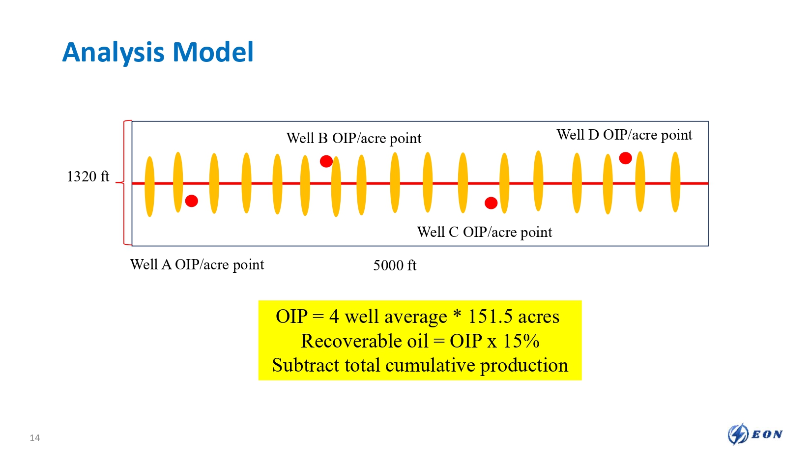 1320 ft OIP = 4 well average * 151.5 acres Recoverable oil = OIP x 15% Subtract total cumulative production Well B OIP/acre point Well C OIP/acre point Well A OIP/acre point 5000 ft Well D OIP/acre point Analysis Model 14