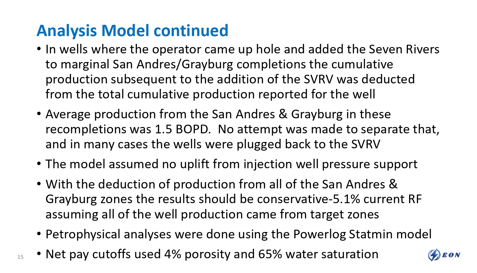 • In wells where the operator came up hole and added the Seven Rivers to marginal San Andres/Grayburg completions the cumulative production subsequent to the addition of the SVRV was deducted from the total cumulative production reported for the well • Average production from the San Andres & Grayburg in these recompletions was 1.5 BOPD. No attempt was made to separate that, and in many cases the wells were plugged back to the SVRV • The model assumed no uplift from injection well pressure support • With the deduction of production from all of the San Andres & Grayburg zones the results should be conservative - 5.1% current RF assuming all of the well production came from target zones • Petrophysical analyses were done using the Powerlog Statmin model • Net pay cutoffs used 4% porosity and 65% water saturation Analysis Model continued 15