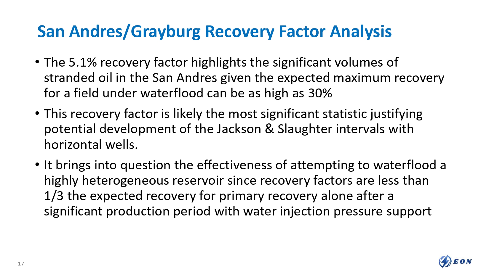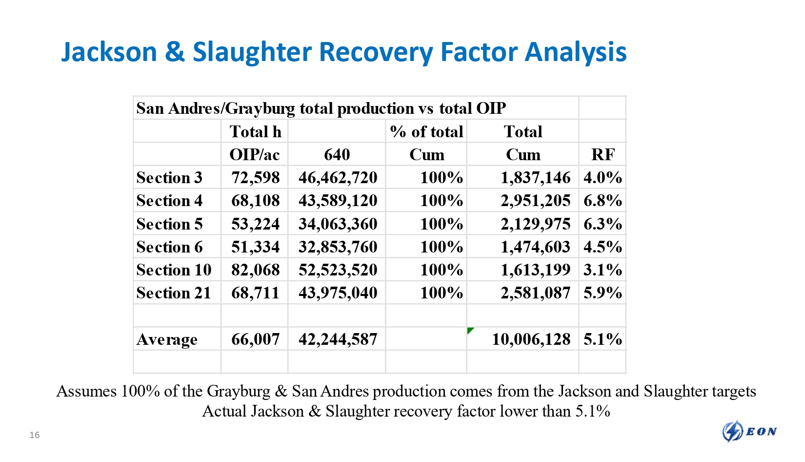 Assumes 100% of the Grayburg & San Andres production comes from the Jackson and Slaughter targets Actual Jackson & Slaughter recovery factor lower than 5.1% Jackson & Slaughter Recovery Factor Analysis San Andres/Grayburg total production vs total OIP Total % of total Total h RF Cum Cum 640 OIP/ac 4.0% 1,837,146 100% 46,462,720 72,598 Section 3 6.8% 2,951,205 100% 43,589,120 68,108 Section 4 6.3% 2,129,975 100% 34,063,360 53,224 Section 5 4.5% 1,474,603 100% 32,853,760 51,334 Section 6 3.1% 1,613,199 100% 52,523,520 82,068 Section 10 5.9% 2,581,087 100% 43,975,040 68,711 Section 21 5.1% 10,006,128 42,244,587 66,007 Average 16