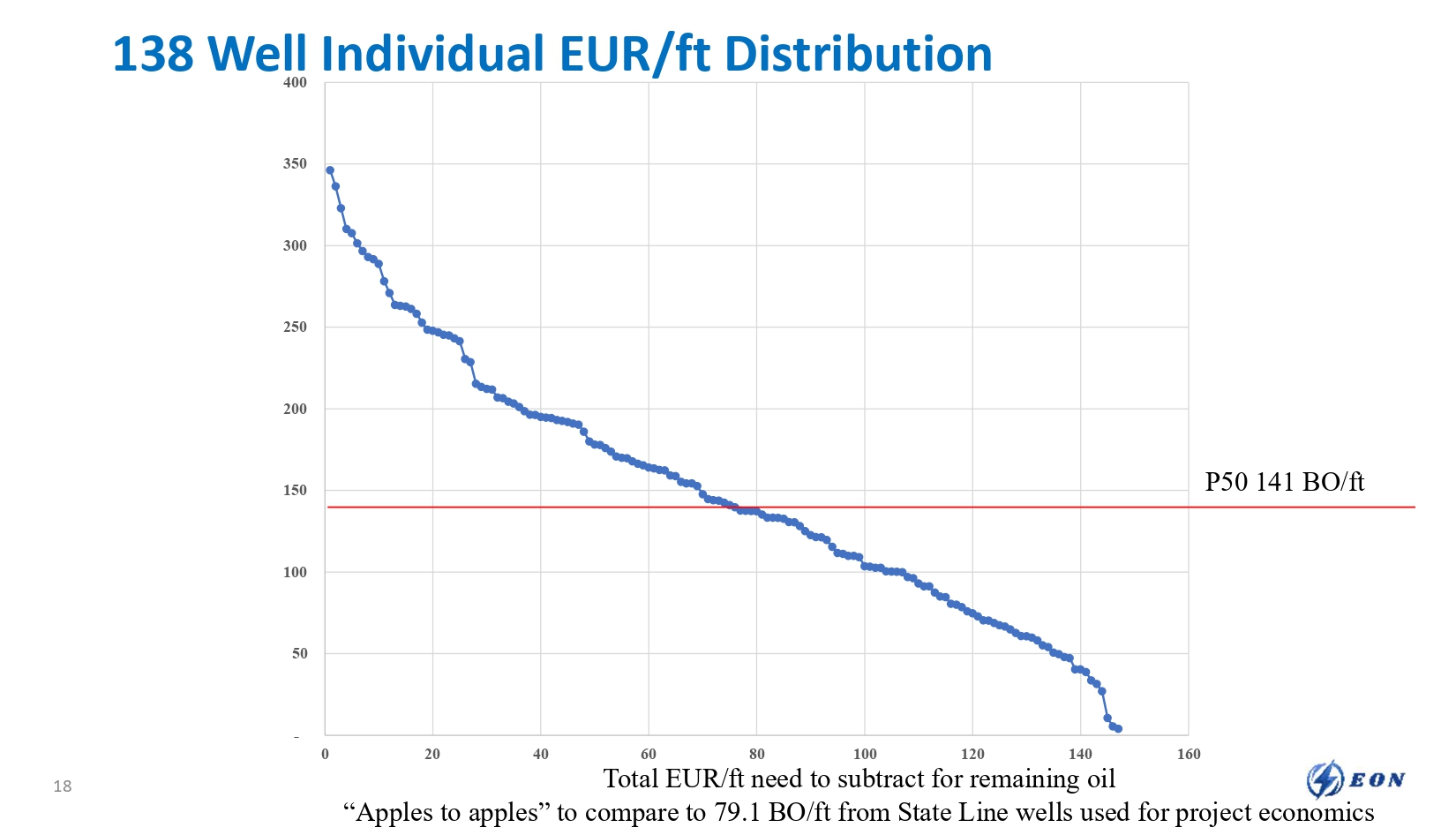 - 50 100 150 200 250 300 350 400 P50 141 BO/ft 0 20 40 60 80 100 120 140 Total EUR/ft need to subtract for remaining oil 160 “Apples to apples” to compare to 79.1 BO/ft from State Line wells used for project economics 138 Well Individual EUR/ft Distribution 18