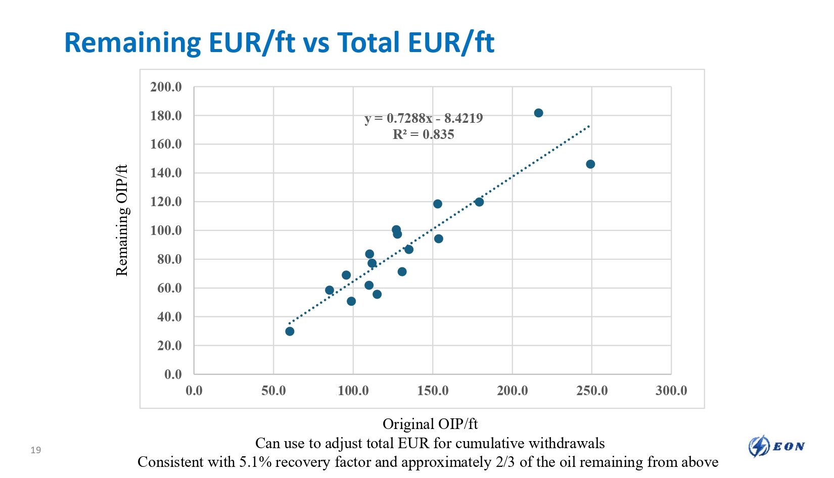 Original OIP/ft Can use to adjust total EUR for cumulative withdrawals Consistent with 5.1% recovery factor and approximately 2/3 of the oil remaining from above Remaining OIP/ft y = 0.7288x - 8.4219 R² = 0.835 200.0 180.0 160.0 140.0 120.0 100.0 80.0 60.0 40.0 20.0 0.0 0.0 50.0 100.0 150.0 200.0 250.0 300.0 Remaining EUR/ft vs Total EUR/ft 19