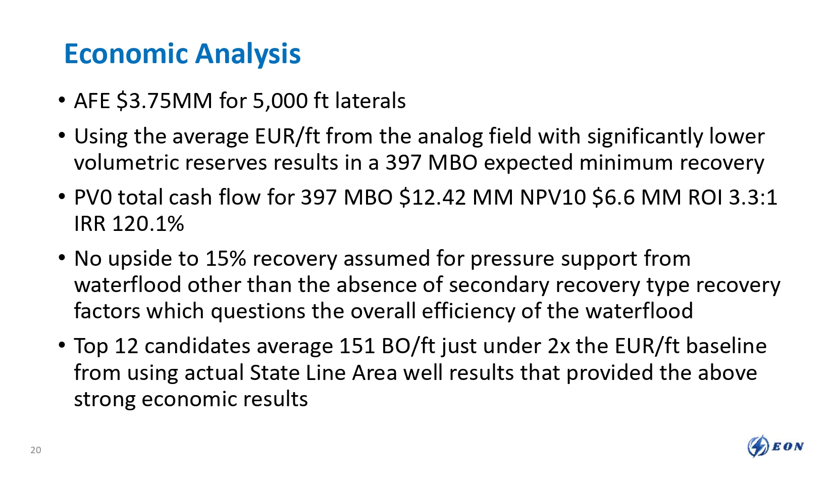 • AFE $3.75MM for 5,000 ft laterals • Using the average EUR/ft from the analog field with significantly lower volumetric reserves results in a 397 MBO expected minimum recovery • PV0 total cash flow for 397 MBO $12.42 MM NPV10 $6.6 MM ROI 3.3:1 IRR 120.1% • No upside to 15% recovery assumed for pressure support from waterflood other than the absence of secondary recovery type recovery factors which questions the overall efficiency of the waterflood • Top 12 candidates average 151 BO/ft just under 2x the EUR/ft baseline from using actual State Line Area well results that provided the above strong economic results Economic Analysis 20