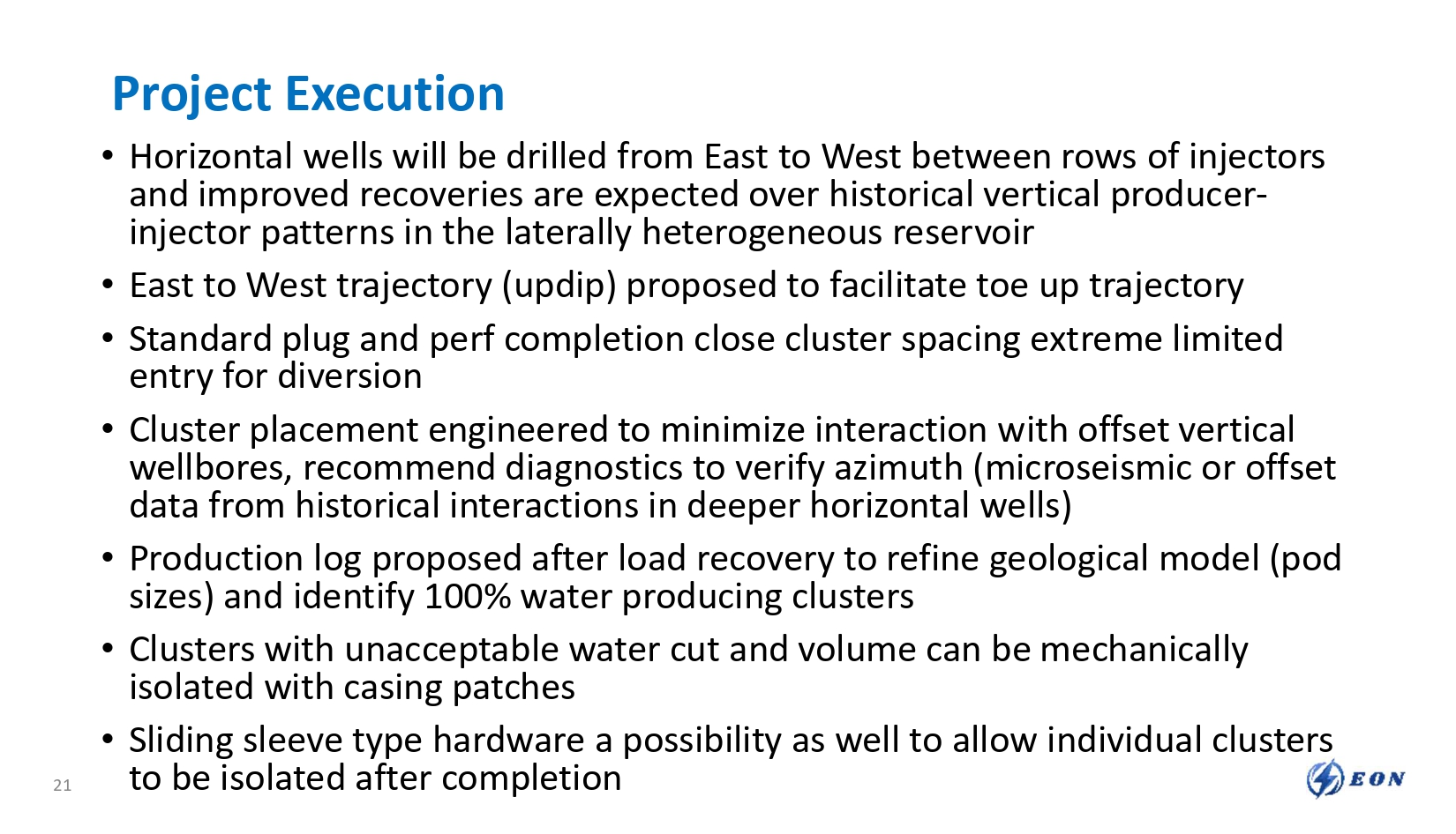 • Horizontal wells will be drilled from East to West between rows of injectors and improved recoveries are expected over historical vertical producer - injector patterns in the laterally heterogeneous reservoir • East to West trajectory (updip) proposed to facilitate toe up trajectory • Standard plug and perf completion close cluster spacing extreme limited entry for diversion • Cluster placement engineered to minimize interaction with offset vertical wellbores, recommend diagnostics to verify azimuth (microseismic or offset data from historical interactions in deeper horizontal wells) • Production log proposed after load recovery to refine geological model (pod sizes) and identify 100% water producing clusters • Clusters with unacceptable water cut and volume can be mechanically isolated with casing patches • Sliding sleeve type hardware a possibility as well to allow individual clusters to be isolated after completion Project Execution 21