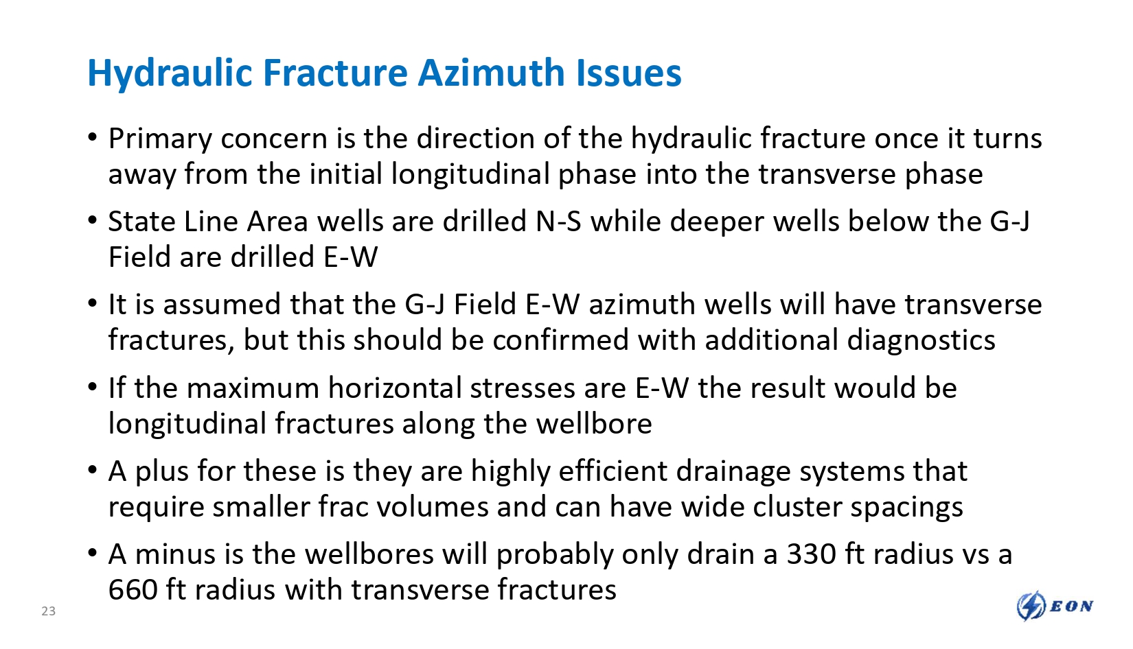 • Primary concern is the direction of the hydraulic fracture once it turns away from the initial longitudinal phase into the transverse phase • State Line Area wells are drilled N - S while deeper wells below the G - J Field are drilled E - W • It is assumed that the G - J Field E - W azimuth wells will have transverse fractures, but this should be confirmed with additional diagnostics • If the maximum horizontal stresses are E - W the result would be longitudinal fractures along the wellbore • A plus for these is they are highly efficient drainage systems that require smaller frac volumes and can have wide cluster spacings • A minus is the wellbores will probably only drain a 330 ft radius vs a 660 ft radius with transverse fractures Hydraulic Fracture Azimuth Issues 23