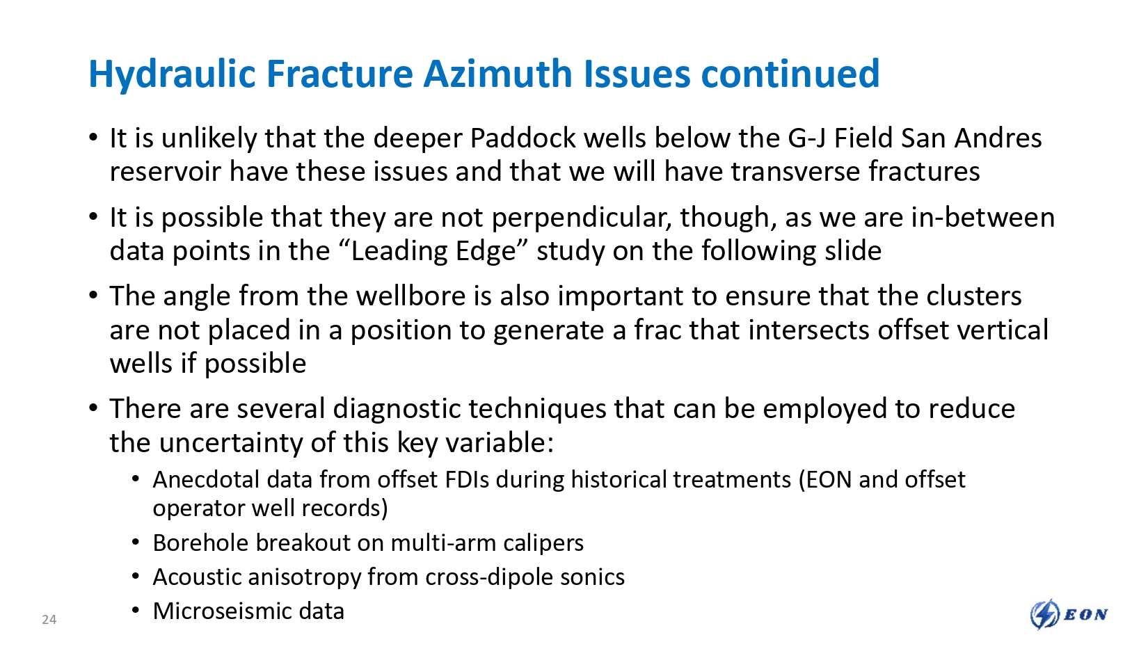• It is unlikely that the deeper Paddock wells below the G - J Field San Andres reservoir have these issues and that we will have transverse fractures • It is possible that they are not perpendicular, though, as we are in - between data points in the “Leading Edge” study on the following slide • The angle from the wellbore is also important to ensure that the clusters are not placed in a position to generate a frac that intersects offset vertical wells if possible • There are several diagnostic techniques that can be employed to reduce the uncertainty of this key variable: • Anecdotal data from offset FDIs during historical treatments (EON and offset operator well records) • Borehole breakout on multi - arm calipers • Acoustic anisotropy from cross - dipole sonics • Microseismic data Hydraulic Fracture Azimuth Issues continued 24