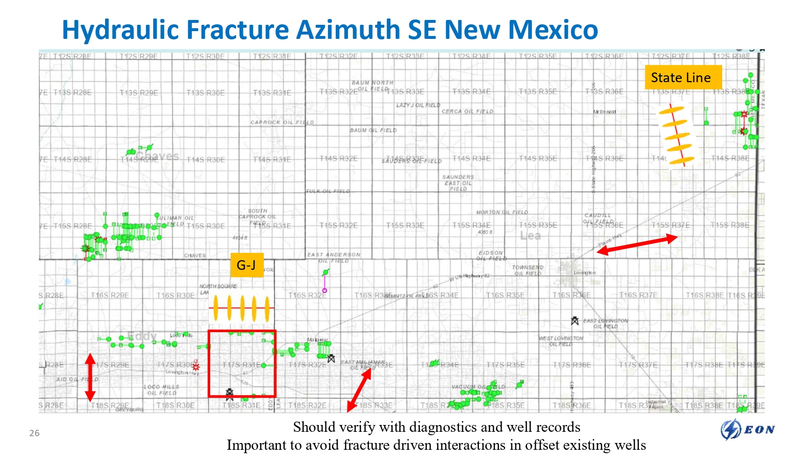 Should verify with diagnostics and well records Important to avoid fracture driven interactions in offset existing wells G - J State Line Hydraulic Fracture Azimuth SE New Mexico 26