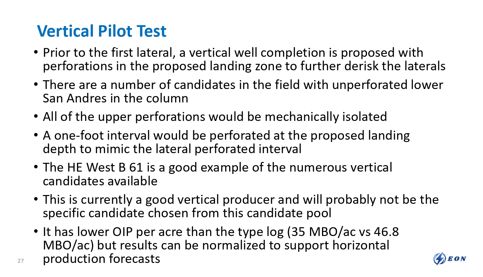 • Prior to the first lateral, a vertical well completion is proposed with perforations in the proposed landing zone to further derisk the laterals • There are a number of candidates in the field with unperforated lower San Andres in the column • All of the upper perforations would be mechanically isolated • A one - foot interval would be perforated at the proposed landing depth to mimic the lateral perforated interval • The HE West B 61 is a good example of the numerous vertical candidates available • This is currently a good vertical producer and will probably not be the specific candidate chosen from this candidate pool • It has lower OIP per acre than the type log (35 MBO/ac vs 46.8 MBO/ac) but results can be normalized to support horizontal production forecasts Vertical Pilot Test 27