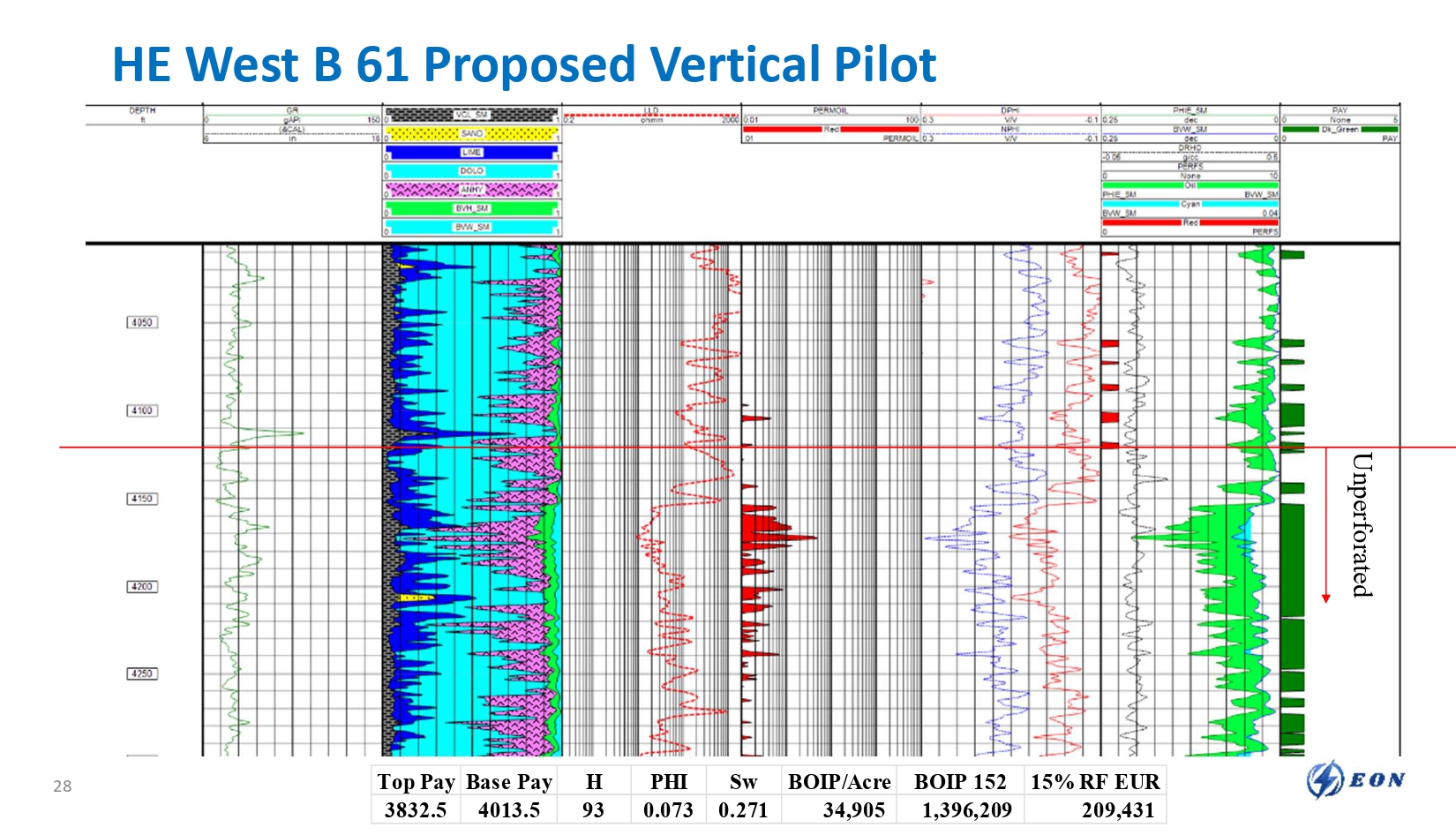 Unperforated 15% RF EUR BOIP 152 BOIP/Acre Sw PHI H Base Pay Top Pay 209,431 1,396,209 34,905 0.271 0.073 93 4013.5 3832.5 HE West B 61 Proposed Vertical Pilot 28