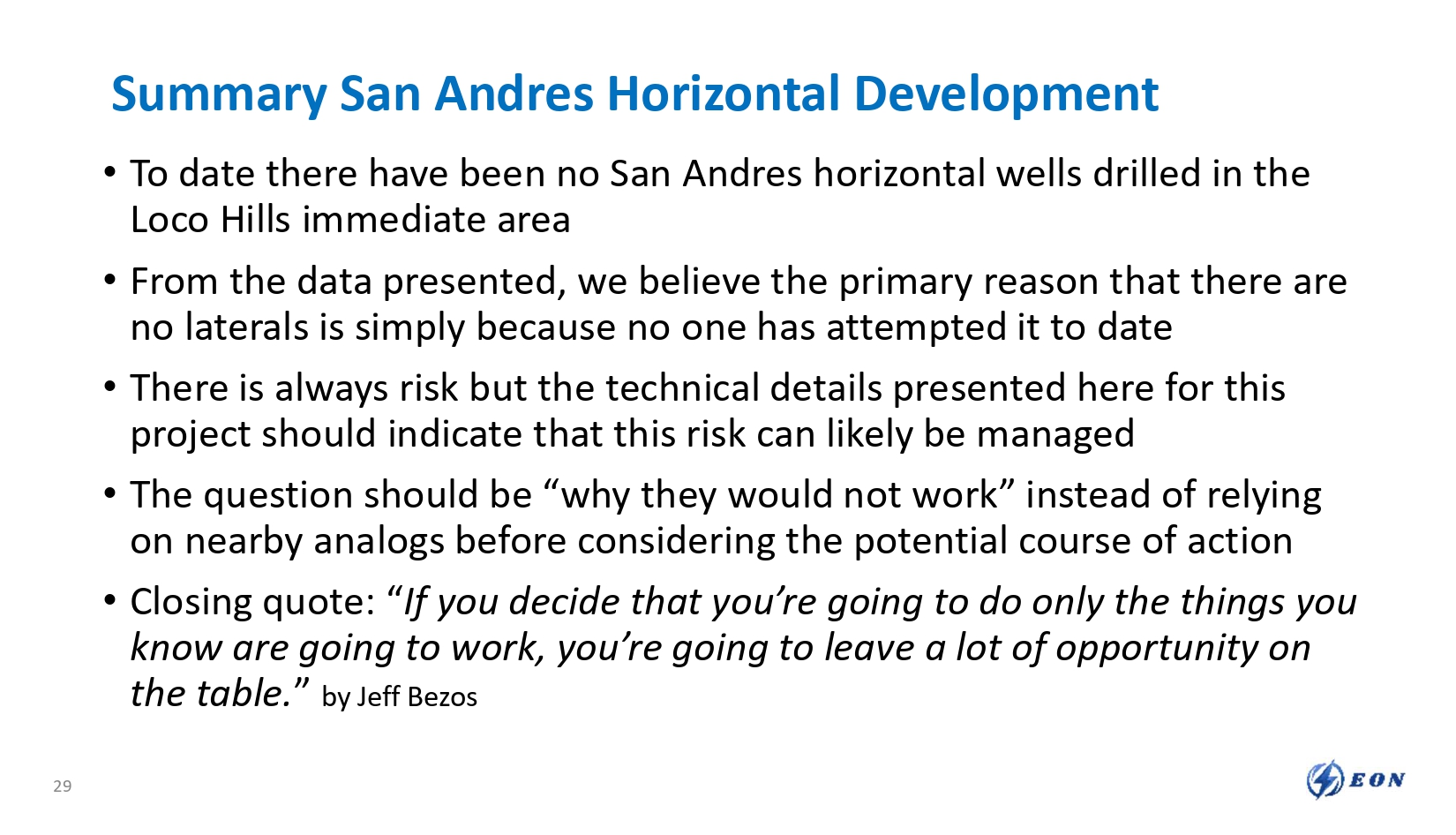 • To date there have been no San Andres horizontal wells drilled in the Loco Hills immediate area • From the data presented, we believe the primary reason that there are no laterals is simply because no one has attempted it to date • There is always risk but the technical details presented here for this project should indicate that this risk can likely be managed • The question should be “why they would not work” instead of relying on nearby analogs before considering the potential course of action • Closing quote: “ If you decide that you’re going to do only the things you know are going to work, you’re going to leave a lot of opportunity on the table. ” by Jeff Bezos Summary San Andres Horizontal Development 29