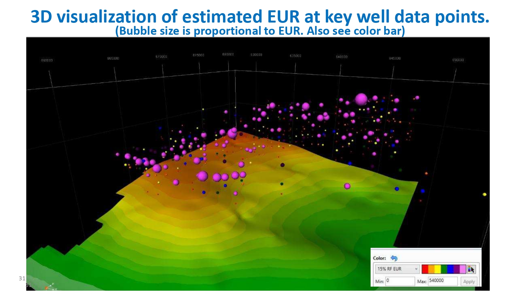 3D visualization of estimated EUR at key well data points. (Bubble size is proportional to EUR. Also see color bar) 31 31
